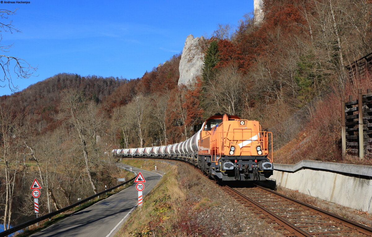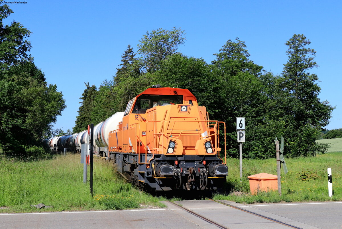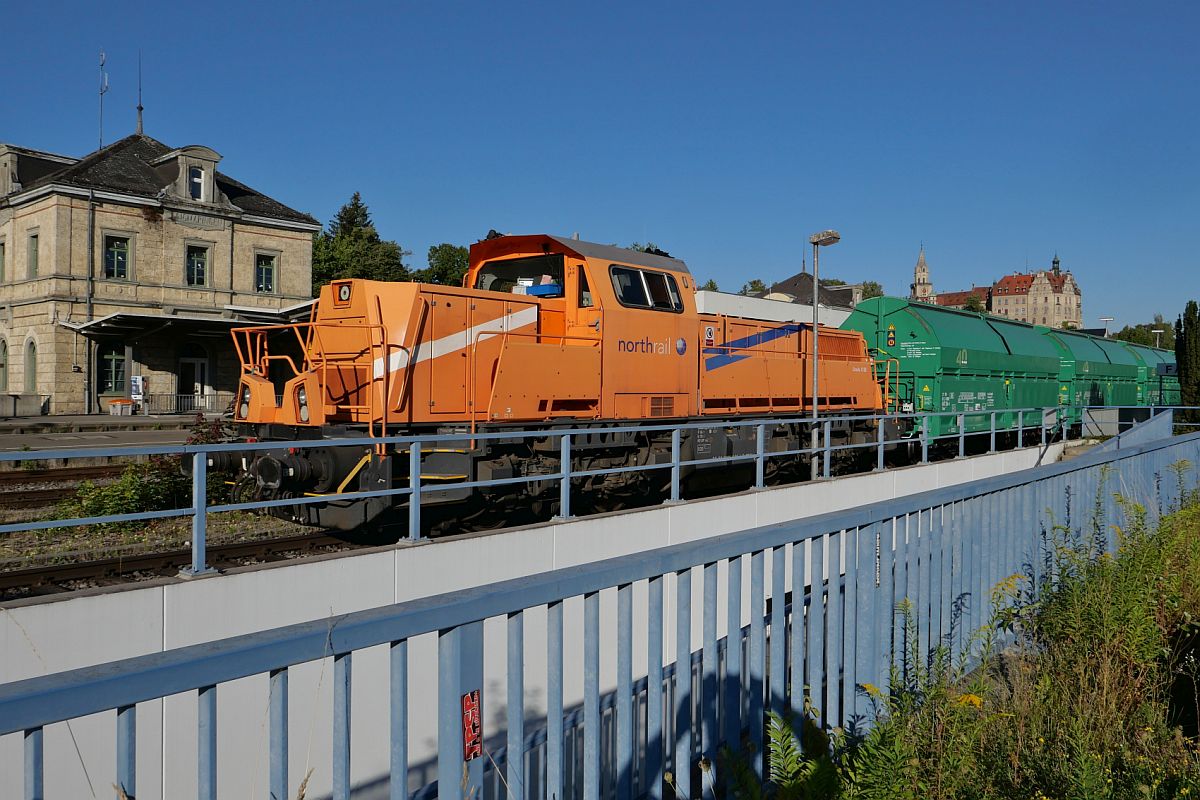 261 302-4 der northrail am Zugende der von 261 300-8 von Mengen bis Sigmaringen gezogenen Wagen der Gattung Talns. Da der Zug nach Haigerloch-Stetten auf Grund einer baubedingten Streckensperrung zwischen Sigmaringendorf und Hanfertal nicht planmäßig, ohne Fahrtrichtungswechsel, durch das Laucherttal fahren konnte, musste über Sigmaringen gefahren werden, was einen Fahrtrichtungswechsel erforderte. Sigmaringen, 11.08.2022