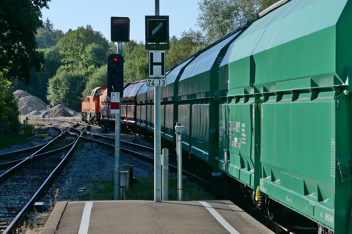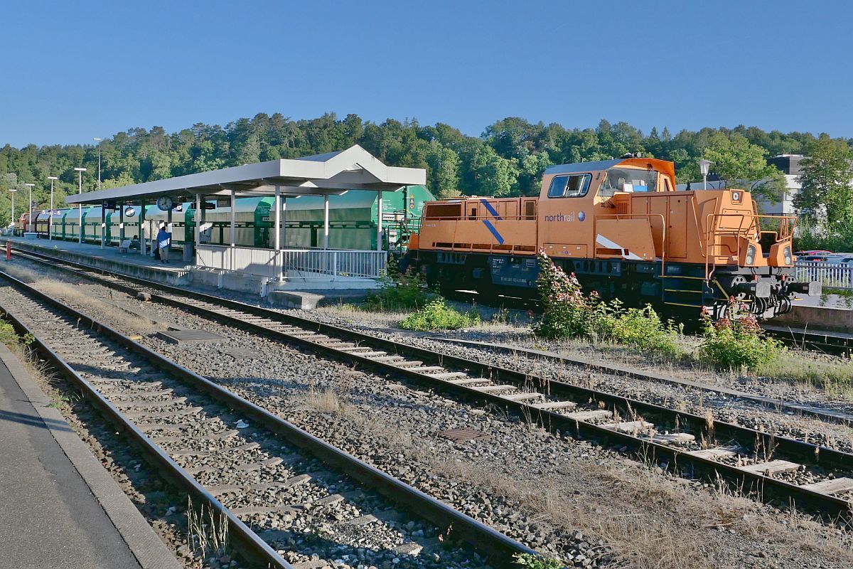 261 302-4 der northrail am Ende des von 261 300-8 (am linken Bildrand schwach sichtbar) von Mengen bis Sigmaringen gezogenen Zuges. Da der Zug nach Haigerloch-Stetten auf Grund einer baubedingten Streckensperrung zwischen Sigmaringendorf und Hanfertal nicht planmäßig, ohne Fahrtrichtungswechsel, durch das Laucherttal fahren konnte, musste über Sigmaringen gefahren werden. Ab Sigmaringen, wo die Aufnahme am 11.08.2022 entstand, wird 261 302-4 den Zug nach Haigerloch-Stetten ziehen.