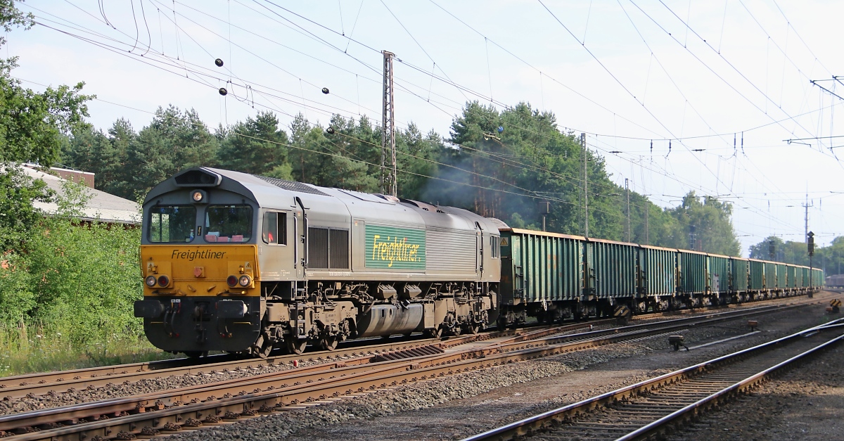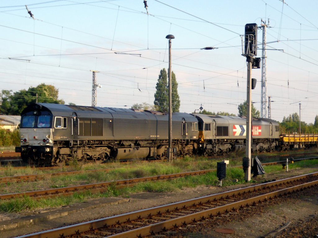 Doppelte Dieselkraft mit einem Altschwellenzug am 01.10.2010 . Zwei Class 66 von Dispo-Lok (266 114-8 und 266 038-9) beim Halt im Bf Oranienburg. Heinz Lahs