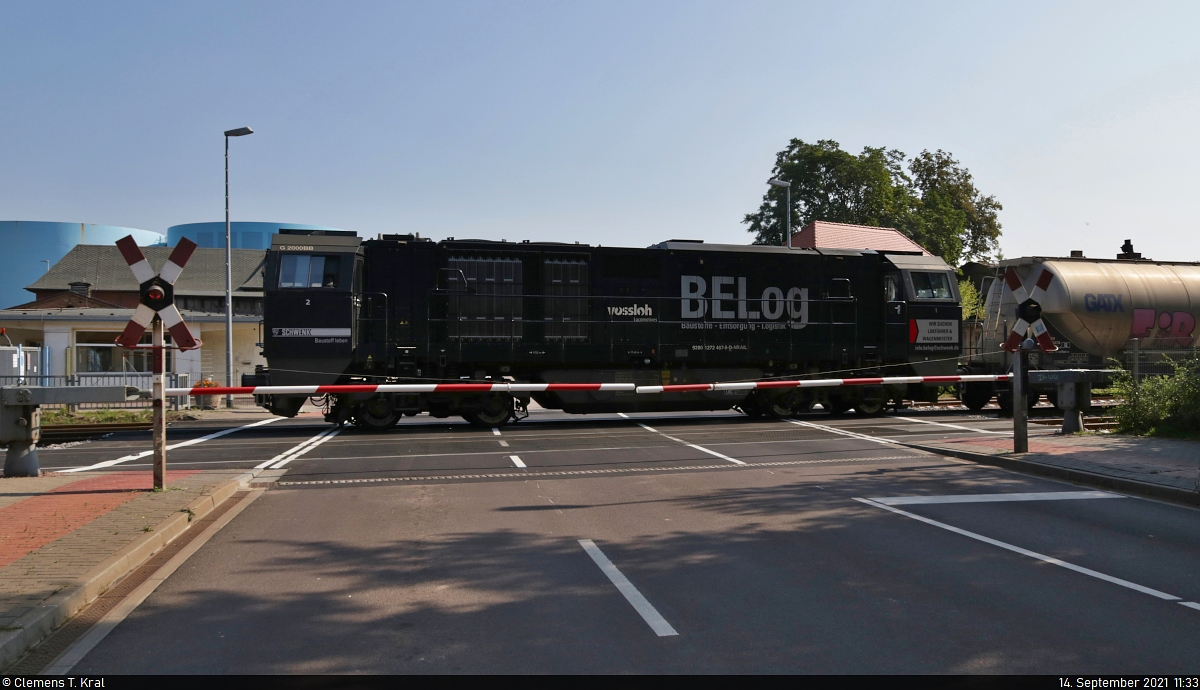 272 407-8 (Vossloh G 2000-3 BB) kehrt zurück vom SCHWENK Zementwerk Bernburg und brummt auf dem Bahnübergang Köthensche Straße Richtung Baalberge.