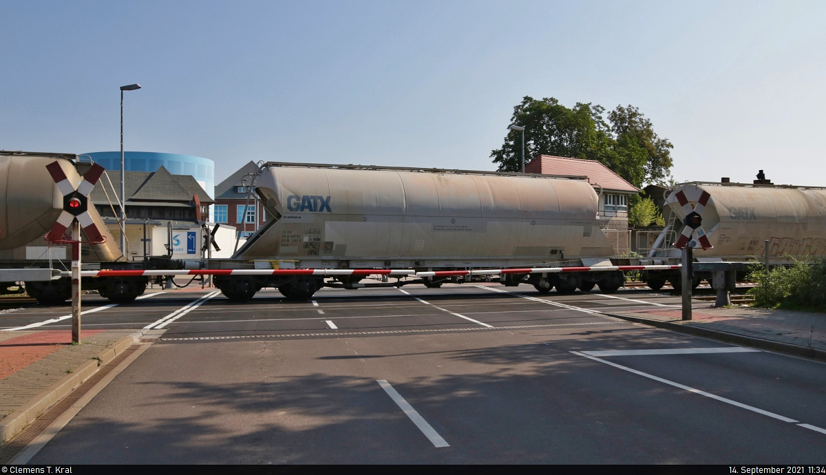 Einer von vielen Staubgutwagen mit der Bezeichnung "Uacs" (33 80 9319 330-2 D-GATXD), der soeben in einem Zementzug mit Zuglok 272 407-8 (Vossloh G 2000-3 BB) den Bahnübergang Köthensche Straße in Bernburg (Saale) Richtung Bernberg-Waldau befährt.