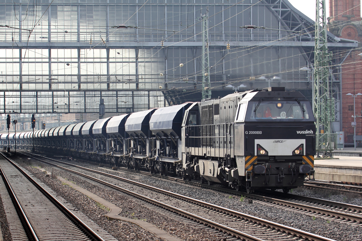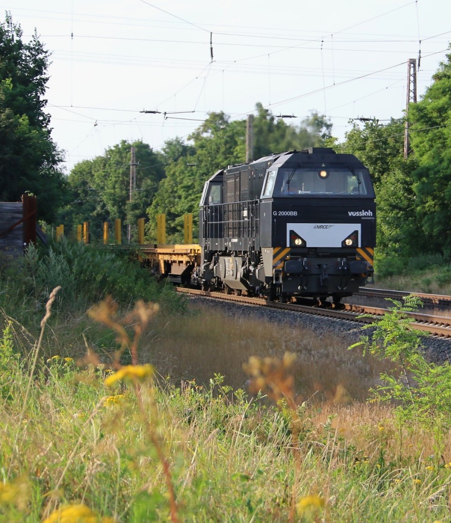 Mit leeren Schüttgutwagen am Haken geht es für 272 407-8 (Vossloh G 2000-3 BB) zur SH Natursteine GmbH und Co. KG bei Löbejün. Dort wird der Löbejüner Quarzporphyr, auch Rhyolith genannt, verladen. Der Prozess dauert mehrere Stunden, für einen kompletten Zug einen ganzen Tag. Die rückwärts fahrende Fuhre auf dem Anschlussgleis, das von Nauendorf kommt, konnte also noch rechtzeitig abgepasst werden, ehe sie erst einmal an der Verladestelle verweilt.
