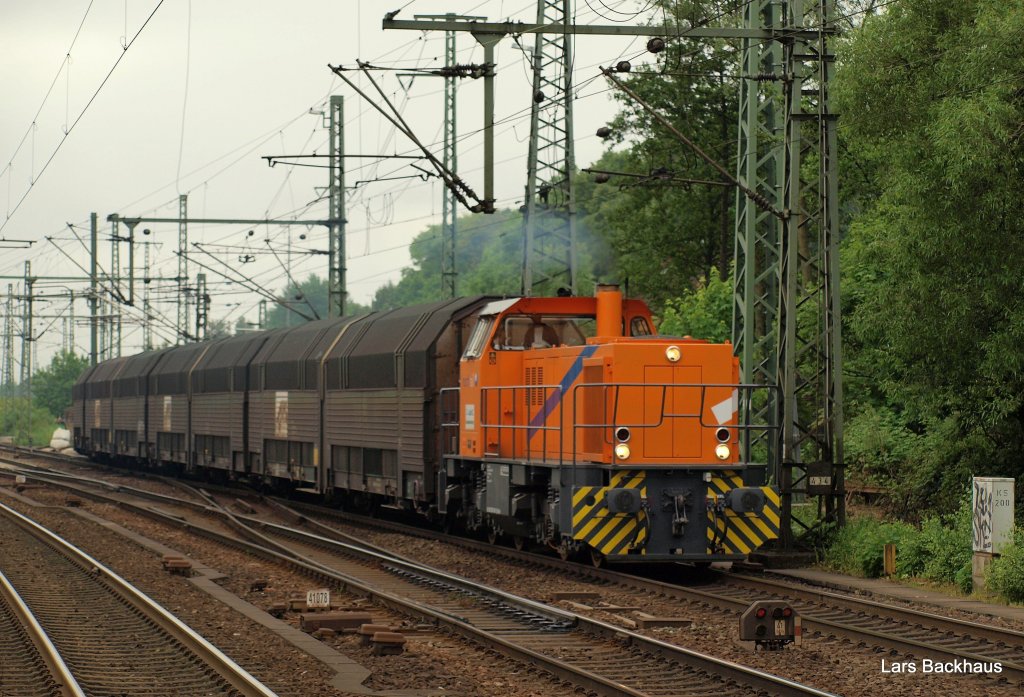 274 104-5 von Northrail hat am 5.06.10 mit einem Autotransportzug Richtung Cuxhaven am Haken. Aufgenommen bei der Ausfahrt aus dem Gbf Hamburg-Harburg.