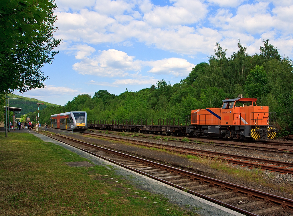 Bahnhof Herdorf am 06.06.2013: Auf Gleis 2 hält gerade der VT 118 ein Stadler GTW 2/6 der Hellertalbahn, er kommt aus Betzdorf und fährt Richtung Neunkirchen. Auf Gleis 4 hat die MaK G 1205 der northrail 274 104-5 (98 80 0274 104-5 D-NTS) mit leeren Sammnps-Schwerlastwagen noch Hp 0, bevor sie Richtung Betzdorf weiterfahren kann. Die MaK wurde 1993 unter der Fabriknummer 1000892 gebaut.
