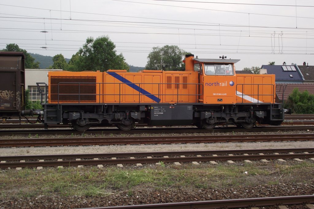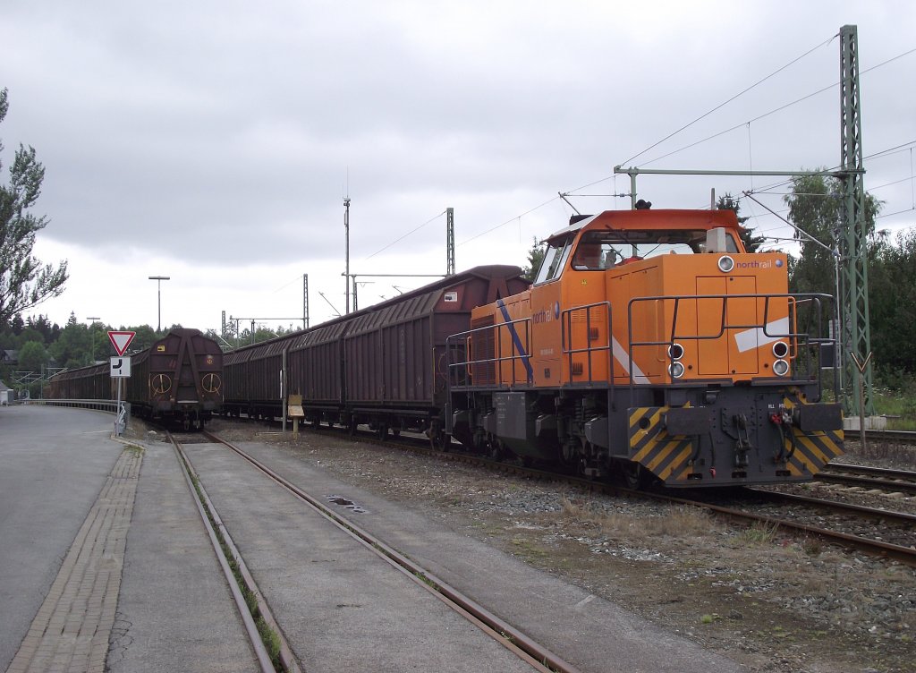 275 803-5 der northrail steht am 11. Juni 2011 mit der Wiegand-Übergabe nach Steinbach am Wald im Bahnhof Lichtenfels und wartet auf die Ausfahrt Richtung Kronach. Frankenwaldbahner