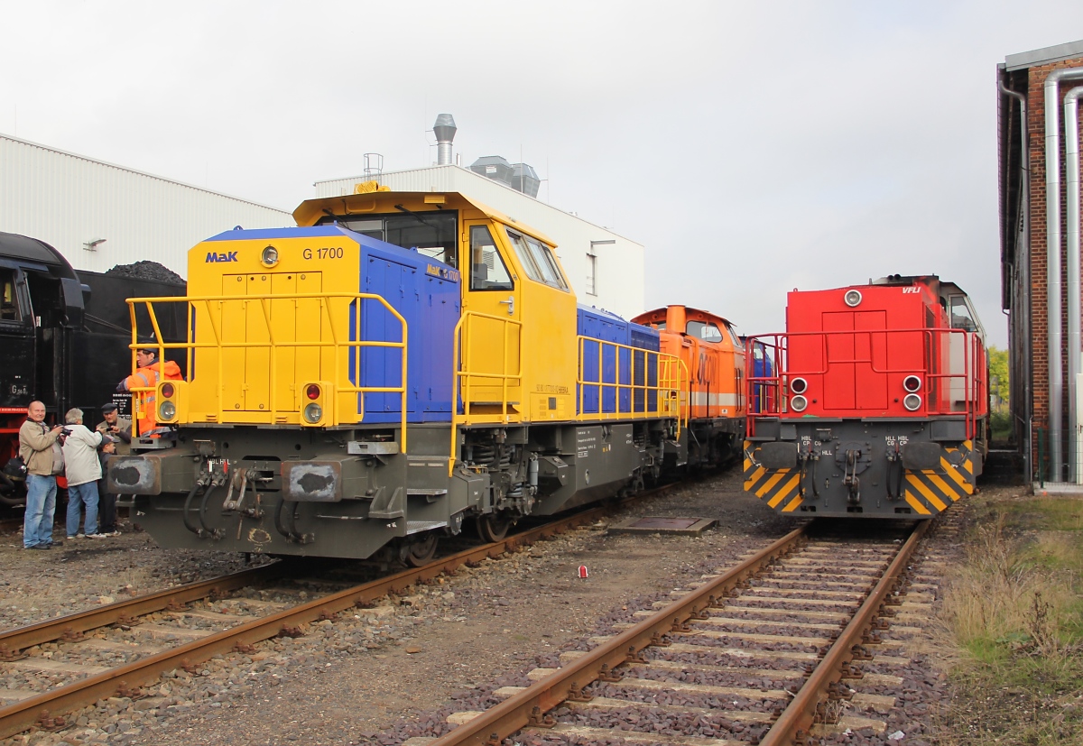 Die Besucherströme im Bahnbetriebswerk Stendal mussten für eine Rangierfahrt der 277 003-0 mit 212 358-6 und 203 153-2 kurz unterbrochen werden. Aufgenommen am Tag der offenen Tür im Bahnbetriebswerk Stendal am 21.09.2013