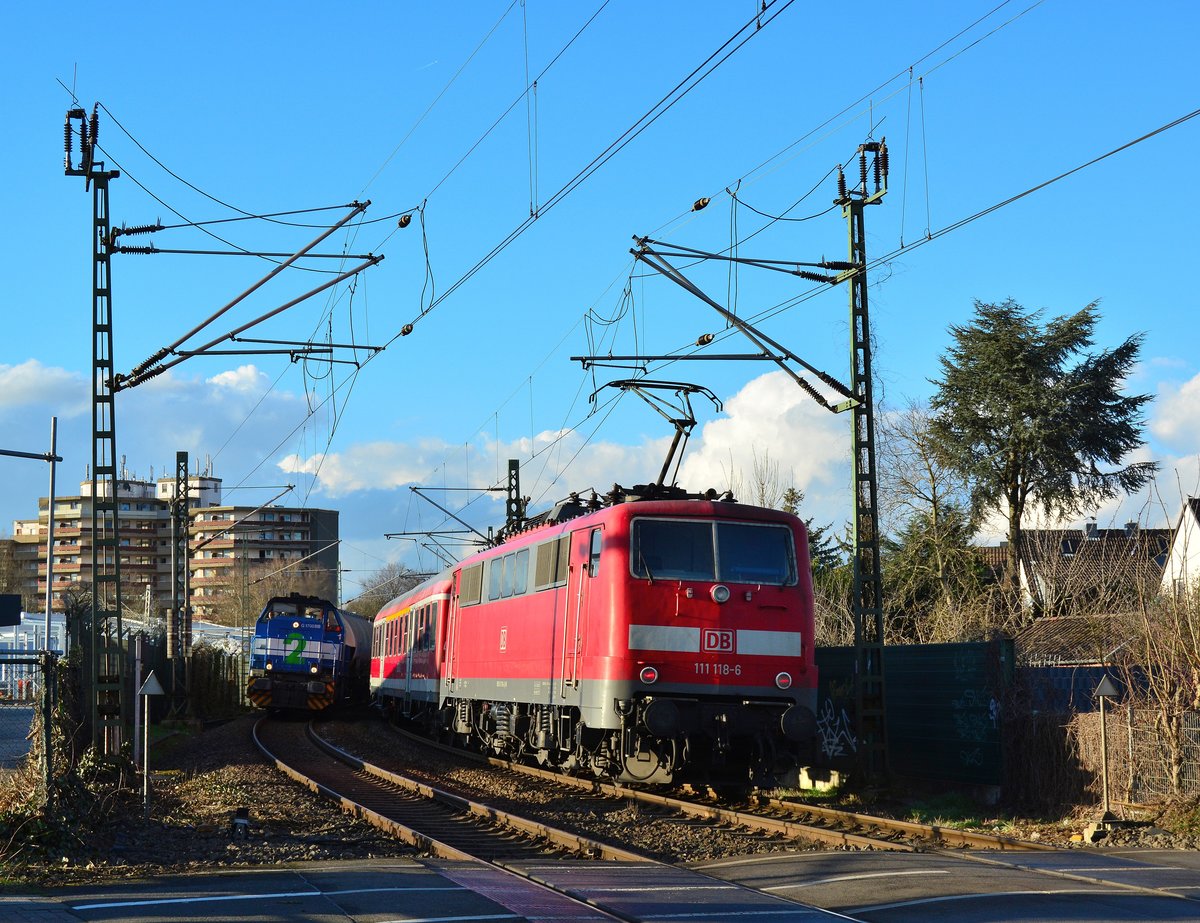 Totgesagte leben länger. Obwohl im letzten Fahrplanwechsel di n-Wagen aus dem regulären Umlauf ausgeschieden sind fahren sie hin und wieder immer noch auf einigen Linien. Hier schiebt 111 118-6 den n-Wagen Park als RE8 Verstärker während 277 803-3 alias NIAG2 mit Braunkohlestaubwagen Richtung Rommerskirchen fährt. Grevenbroich 09.03.2017