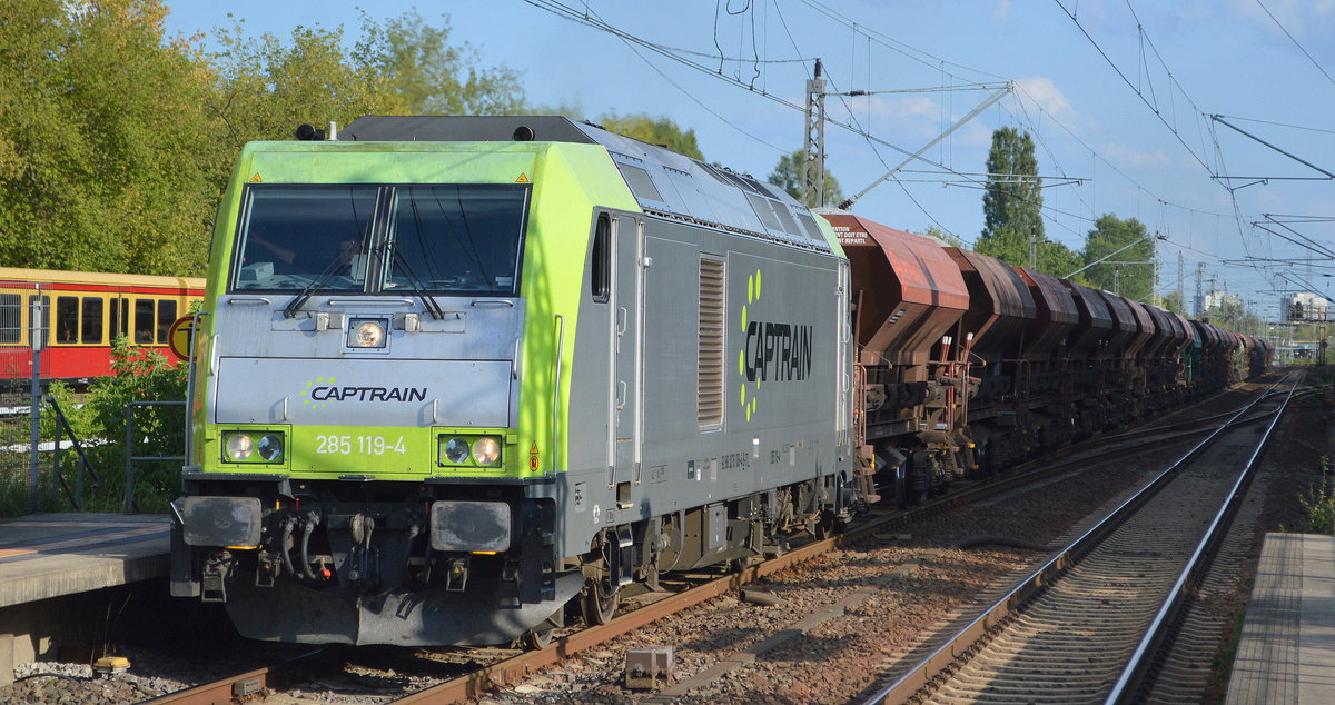ITL - Eisenbahngesellschaft mbH mit Captrain  285 119-4  [NVR-Number: 92 88 0076 108-4 B-ITL] und einem Schüttgutwagenzug aus Richtung Industrieübergabe Nordost in Berlin am 15.11.18 Bf. Berlin-Hohenschönhausen, 15.11.18