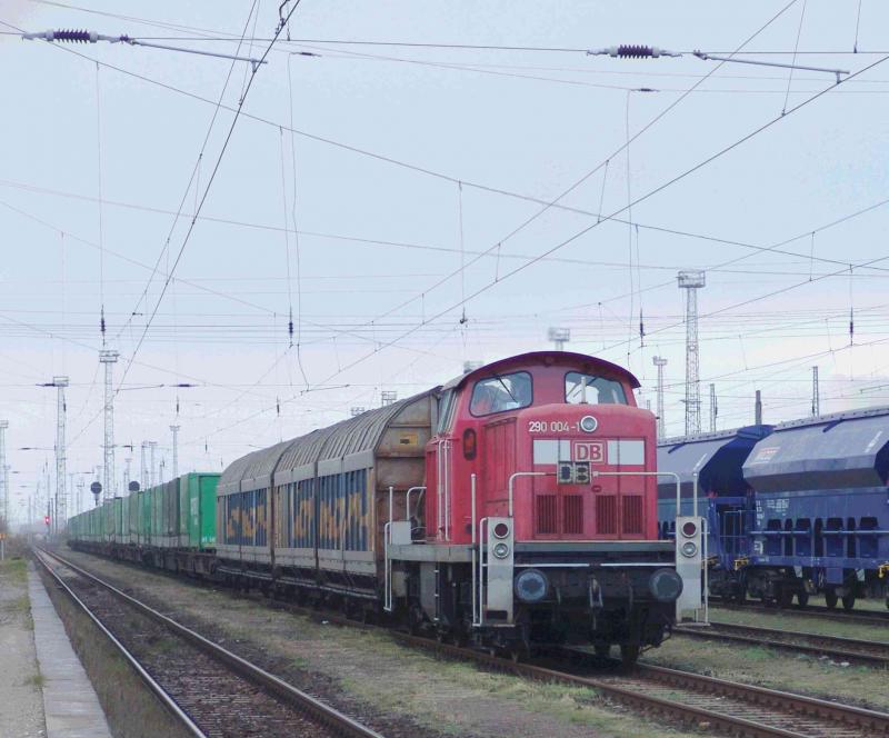 Die 290 004-1 stellt in der Ausfahrgruppe Rostock-Seehafen einen KLV-Zug nach Verona bereit.(08.12.04)