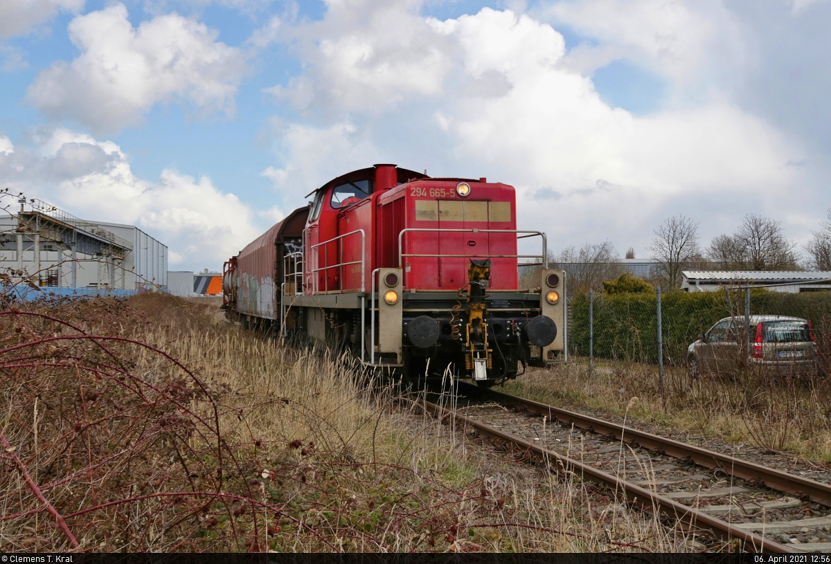 294 665-5 (294 165-0 | 294 165-6 | 290 165-0 | DB V 90) steht auf der sehr selten bedienten und meines Wissens nach noch nicht dokumentierten Anschlussbahn zwischen dem Kanenaer Weg und der Grenzstraße in Halle (Saale). Am Haken hat sie einen Flachwagen mit Planenverdeck der Gattung "Rilns 654.1" (31 80 3546 093-6 D-DB) und einen Containertragwagen samt Tankcontainern der Gattung "Sngs 1" (37 80 4558 246-7 D-ERR), abgeholt im ABB Trafowerk Halle (Saale), wo zuvor ein Trafo hineingeschoben wurde.