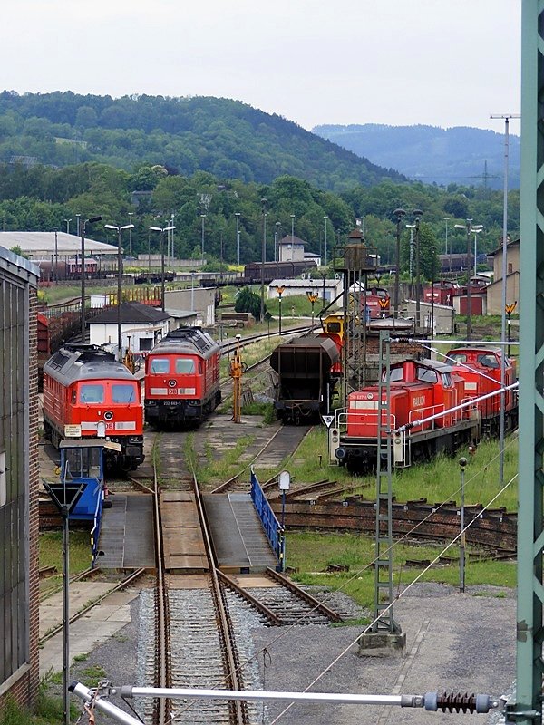 Der bekannte Blick auf das Bw Saalfeld am 13.5.2009. Zusehen sind vorn (v.l.n.r) 232 347-5, 232 668-5, 290 637-8 und eine 203. Im Hintergrund verschiedene 204 (hinter dem Sandturm die 204 805-6). Christopher Pätz
