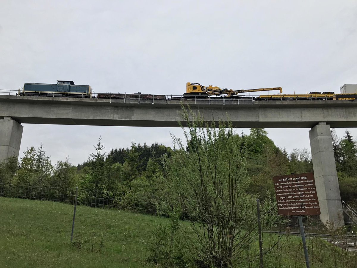 Fahrt in Richtung Wangen i.A. Bahnhof über die Autobahn A96 (das sog. Millionenloch), wo gerade die Allgäubahn elektrifiziert wird.