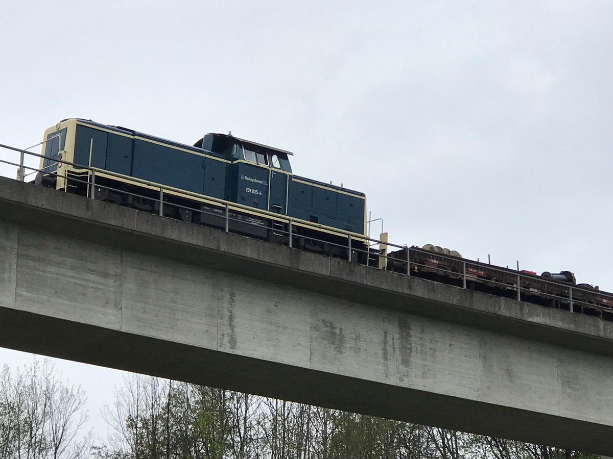 291 035-4 als Bauzug im Allgäu am 12.05.2019 Fahrt in Richtung Wangen i.A. Bahnhof über die Autobahn A96 (das sog. Millionenloch), wo gerade die Allgäubahn elektrifiziert wird.
