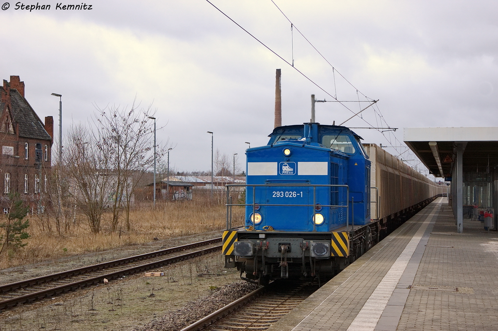 293 026-1 PRESS (202 746-4) mit einem leeren Hackschnitzelzug, bei der Durchfahrt in Rathenow und fuhr in Richtung Wustermark weiter. 03.02.2013 Stephan Kemnitz