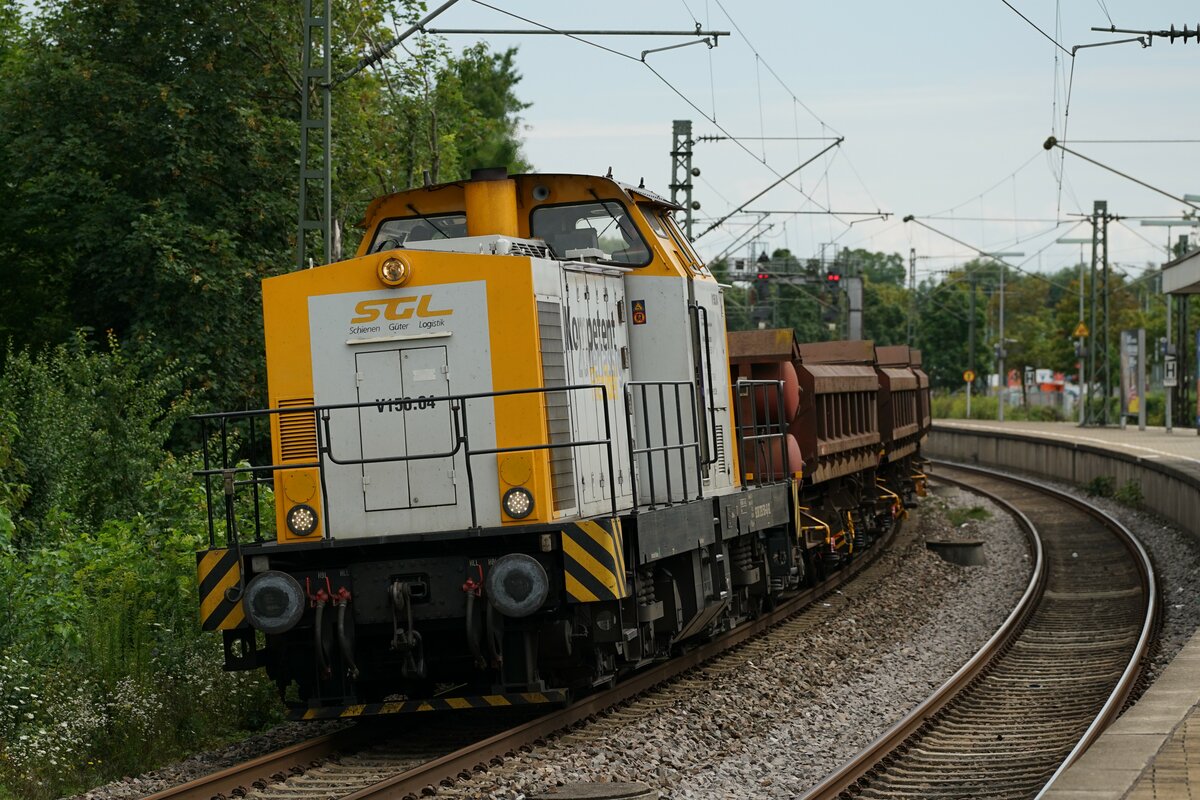 Die 293 510-4 der SGL fuhr am 10. August 2021 mit ihrem Schotterzug durch den Bahnhof Tamm (Württ).