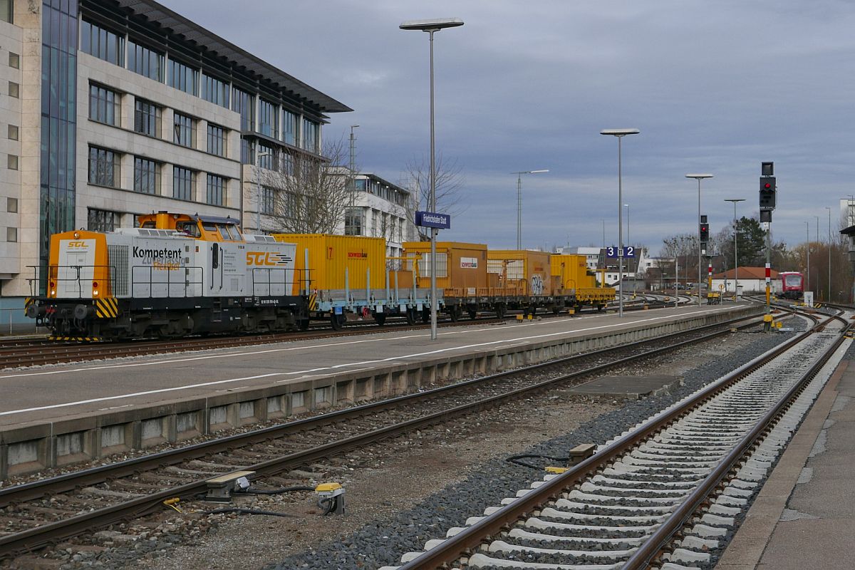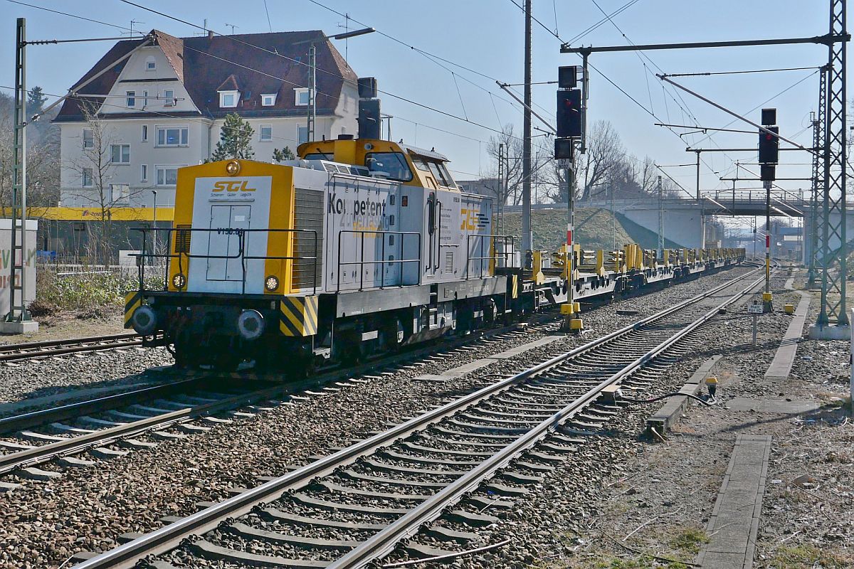 Im Rahmen von Gleisbauarbeiten zwischen Friedrichshafen und Kressbronn war auch 293 510-4 der SGL im Einsatz. Am 09.03.2018 befindet sich die V150.04 mit einem kurzen Bauwagenzug auf Rangierfahrt im Bahnhof von Friedrichshafen.