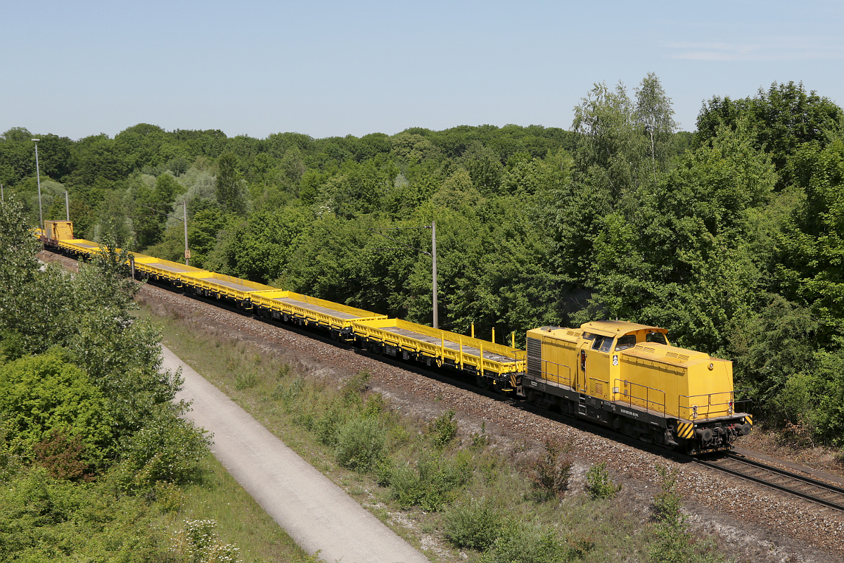 SGL V150.04 (293 510-4) passiert mit ihrer Fuhre die nördliche Umgehung des Rangierbahnhofs München Nord, 07.06.2014