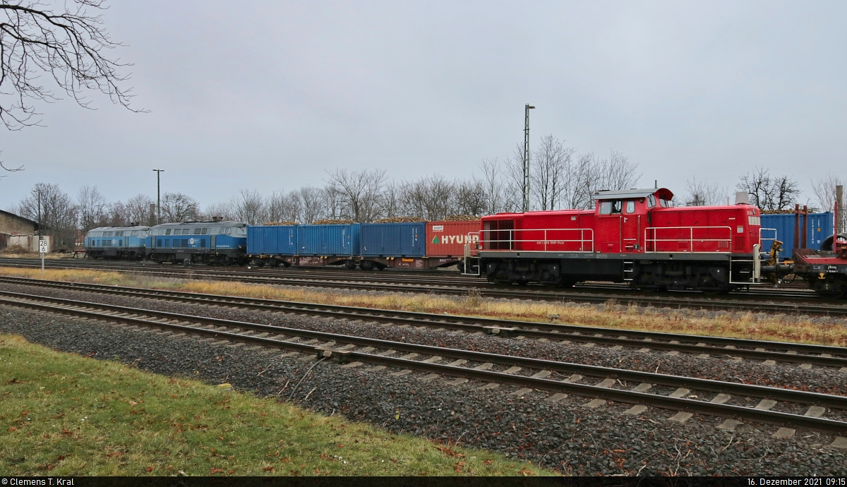 Bundesbahn-Flair im Bahnhof Könnern: Während außerplanmäßig 294 668-9 (294 168-0 | 290 168-4 | DB V 90) mit der Übergabe aus Rothenburg (Saale) bereitsteht, sind 218 002-4 (225 802-8) und 225 002-5 (215 002-7) mit dem Rübenverkehr für die Zuckerfabrik beschäftigt (weitere Bilder folgen). 🧰 DB Cargo | Eisenbahngesellschaft Potsdam mbH (EGP) 🕓 16.12.2021 | 9:15 Uhr