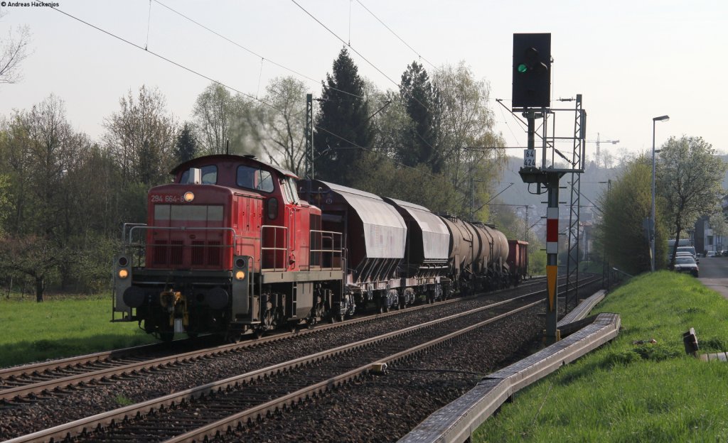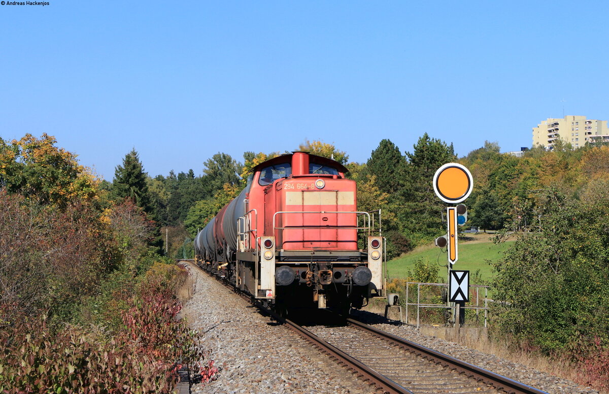 Die letzten interessanten Zugleistungen auf der Teckbahn sind die mit der BR 294 bespannten Güterzüge. Am 26.4.2011 machte ich mich am Morgen auf, um 294 664-8 mit ihrem kurzen Kesselwagenzug von Plochingen nach Oberlenningen kurz hinter dem Bahnhof Dettingen aufzunehmen.