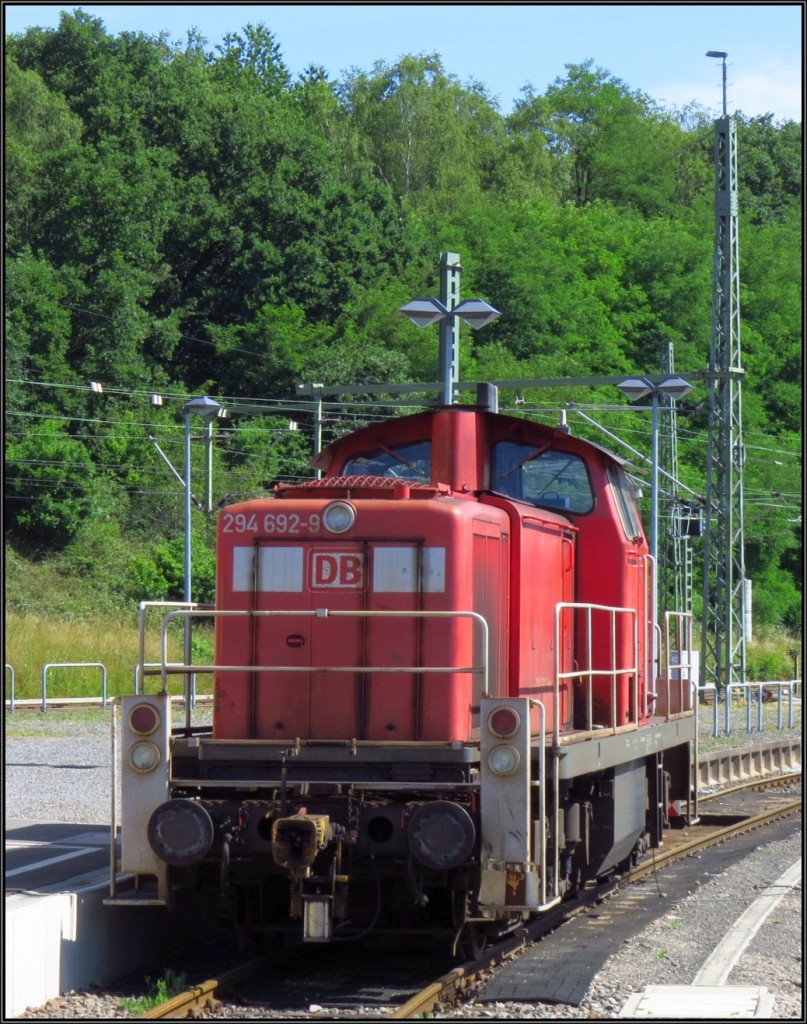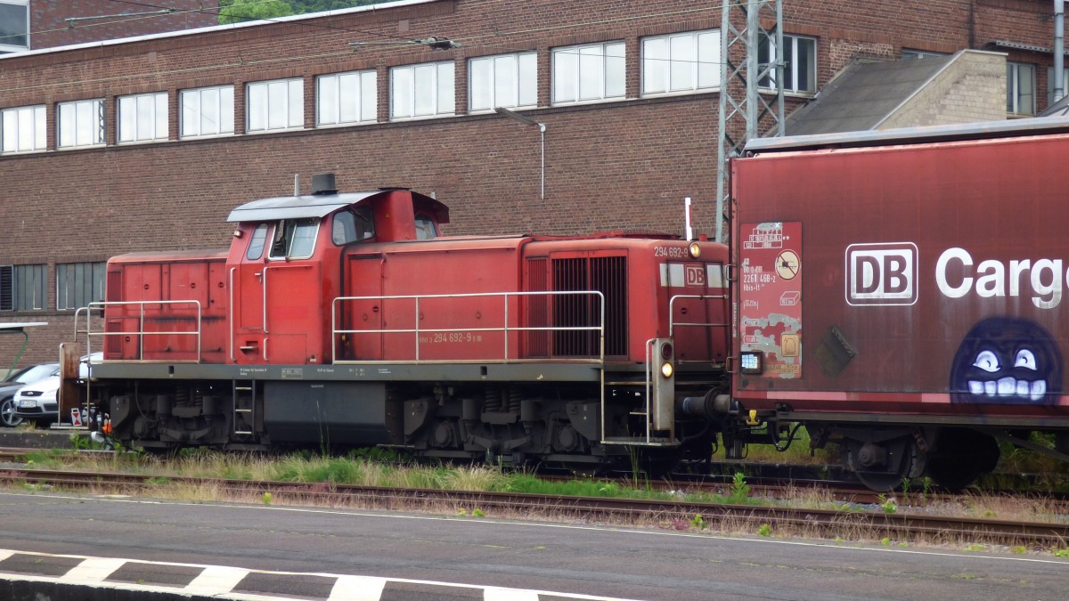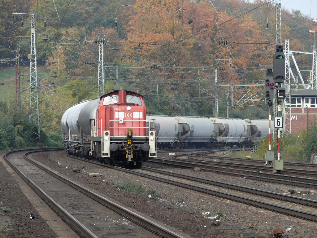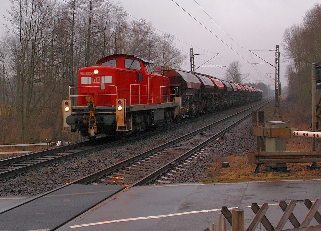 Die 294 692-9 mit einem Güterzug bei Kaarst Broicher Seite kurz vorm Bahnübergang.