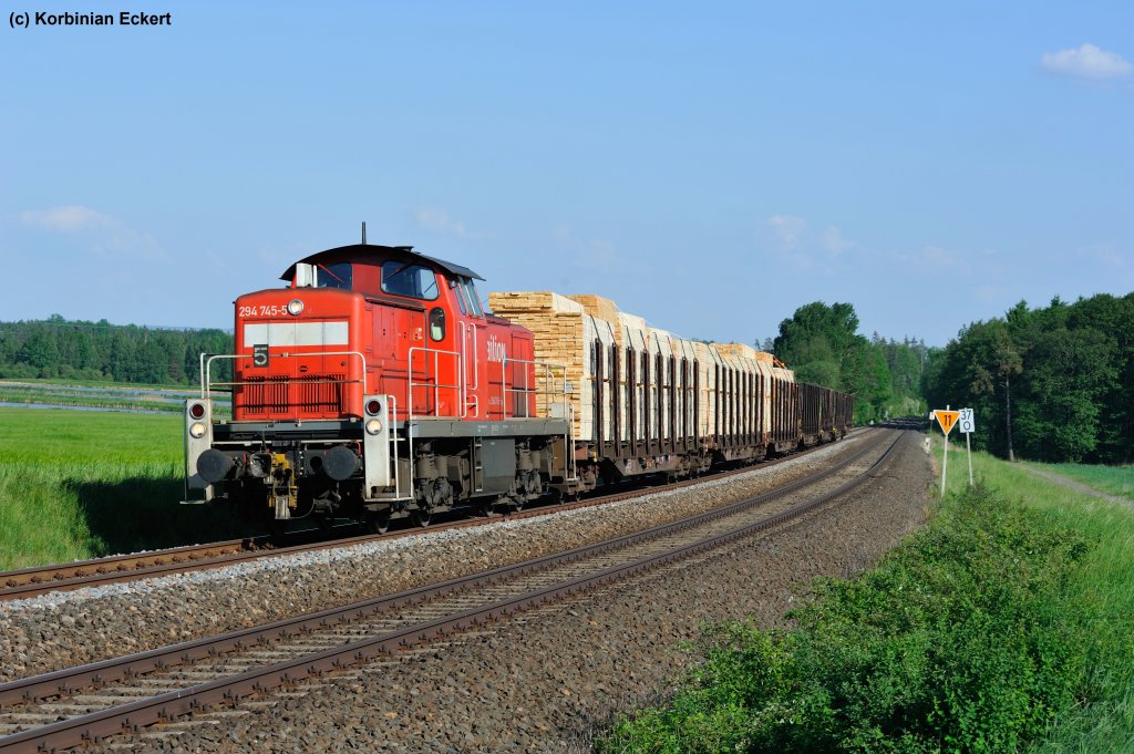 294 745-5 mit der Übergabe aus Wiesau (Oberpf) nach Marktredwitz mit mehreren Holzwagen bei Oberteich, 23.05.2012