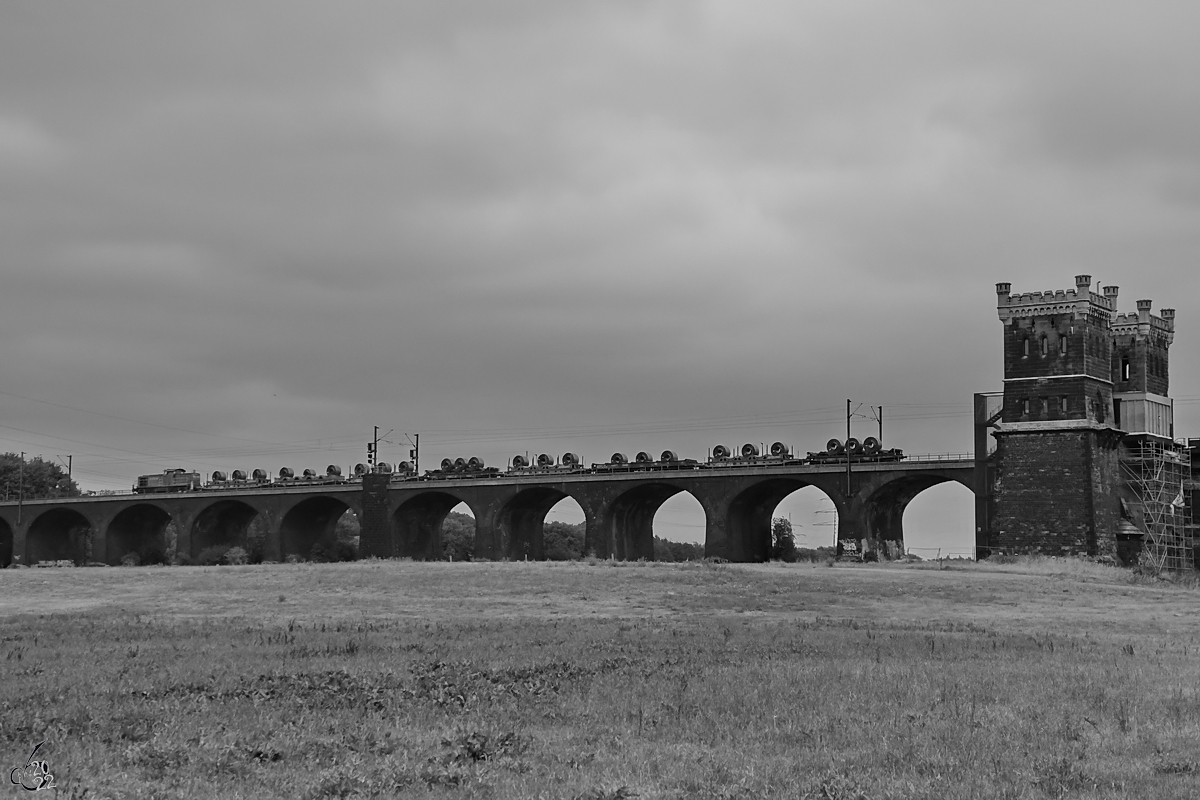 Die DB-Diesellokomotive 294 773-7 zieht einen Coilzug über die Hochfelder Eisenbahnbrücke, so gesehen Ende August 2022 in Duisburg.