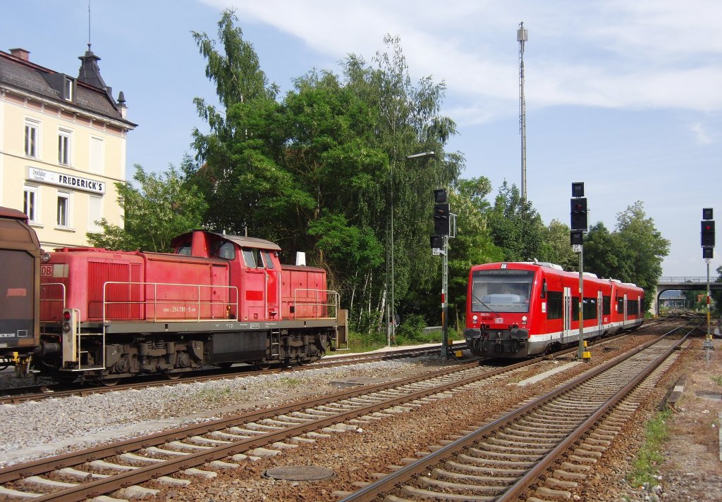 Im Bahnhof Biberach (Riß) steht 294 788-5 bereit, um kurz nach der Einfahrt der in Biberach (Riß) Süd abgefahrenen RB 22594 weiterzufahren. Während die 294er nur wenige Kilometer weiter zu einem Firmengelände fahren wird stehen die beiden Regioshuttle am Beginn ihrer Fahrt nach Langenau (19.06.2013). Jürgen Vos