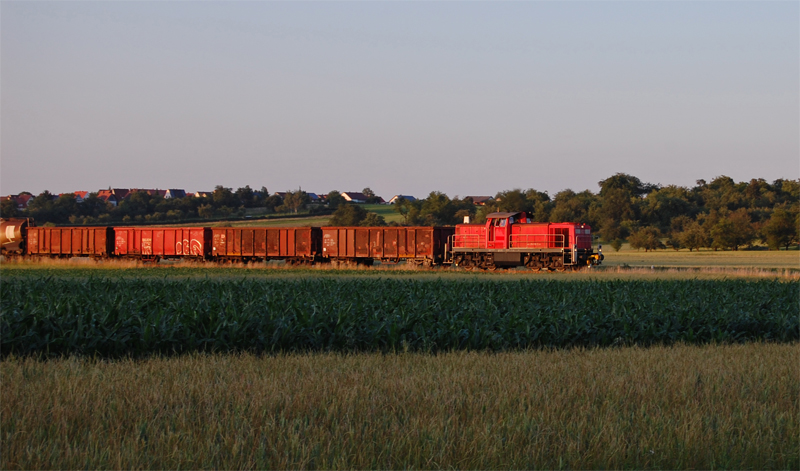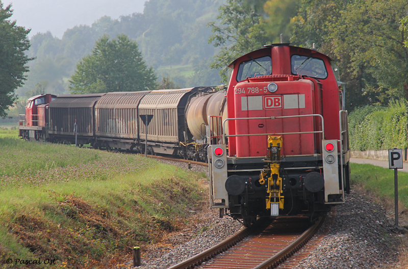 Während Deutschland in der Fußball-EM gegen Griechenland spielte, zog 294 788-5 von dem unbeirrt ihren abendlichen Güterzug über die Teckbahn nach Oberlenningen. Die Uhr zeigte am 22.06.2012 gerade 20:56, als die Lok meinen Standpunkt zwischen Dettingen und Owen mit einem tollen Sound passierte. Wen interessiert da schon ein Fußballspiel. ;-) Pascal Ost