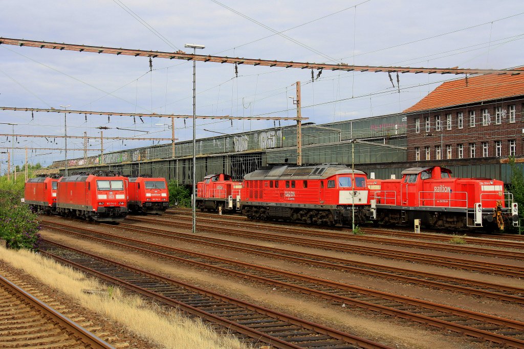 185 174-0,185 084-1 beide von DB, 185 224-3 von Railion, 155 060-7 DB, 294 830-5 von Railion, 294 769-5, 294 798-4 von Railion und 232 909-2 auch von Railion stehen in Wanne-Eickel-HBF bei Sonnenschein am 21.7.2012.