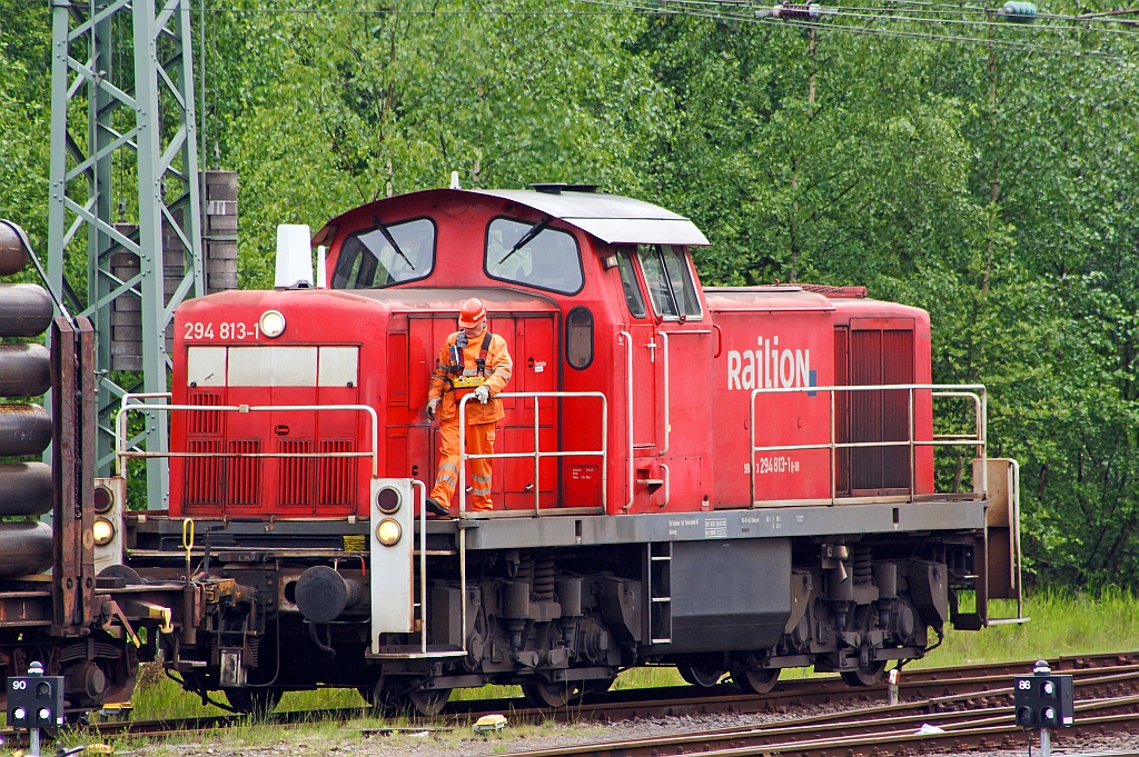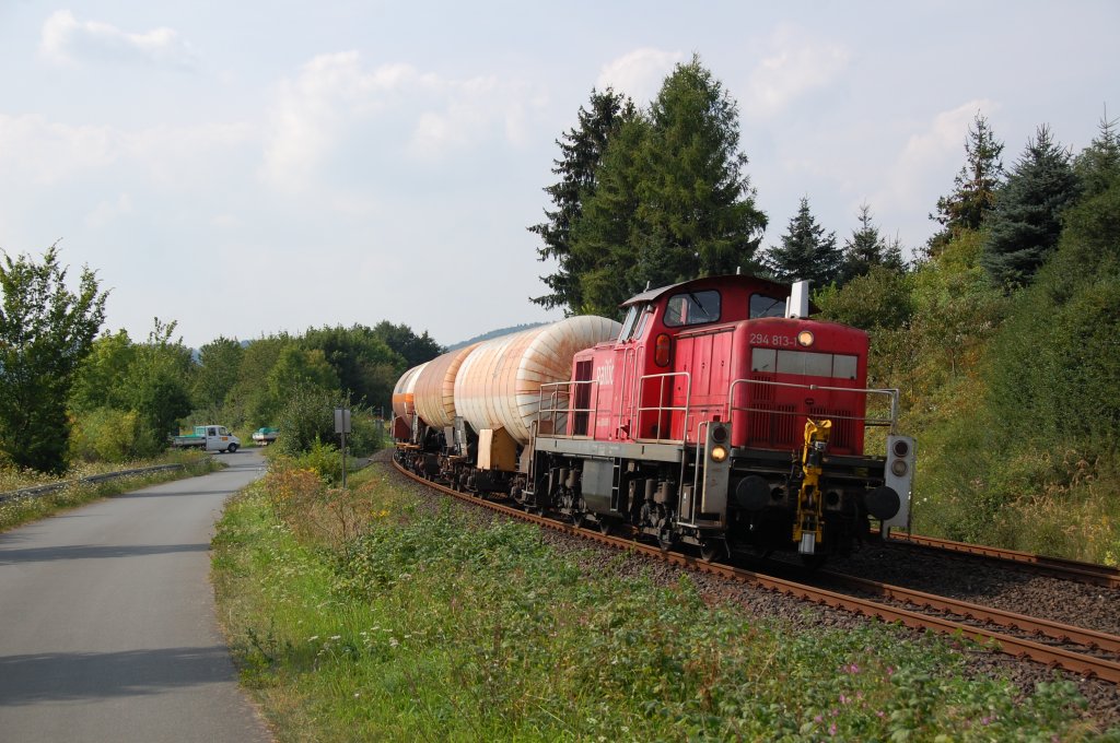 Die 294 813-1 (V 90 remotorisiert) der DB Schenker Rail Deutschland AG hat einen Rungenwagen mit Rohren abgestellt, Kreuztal am 18.05.2012. Armin Schwarz