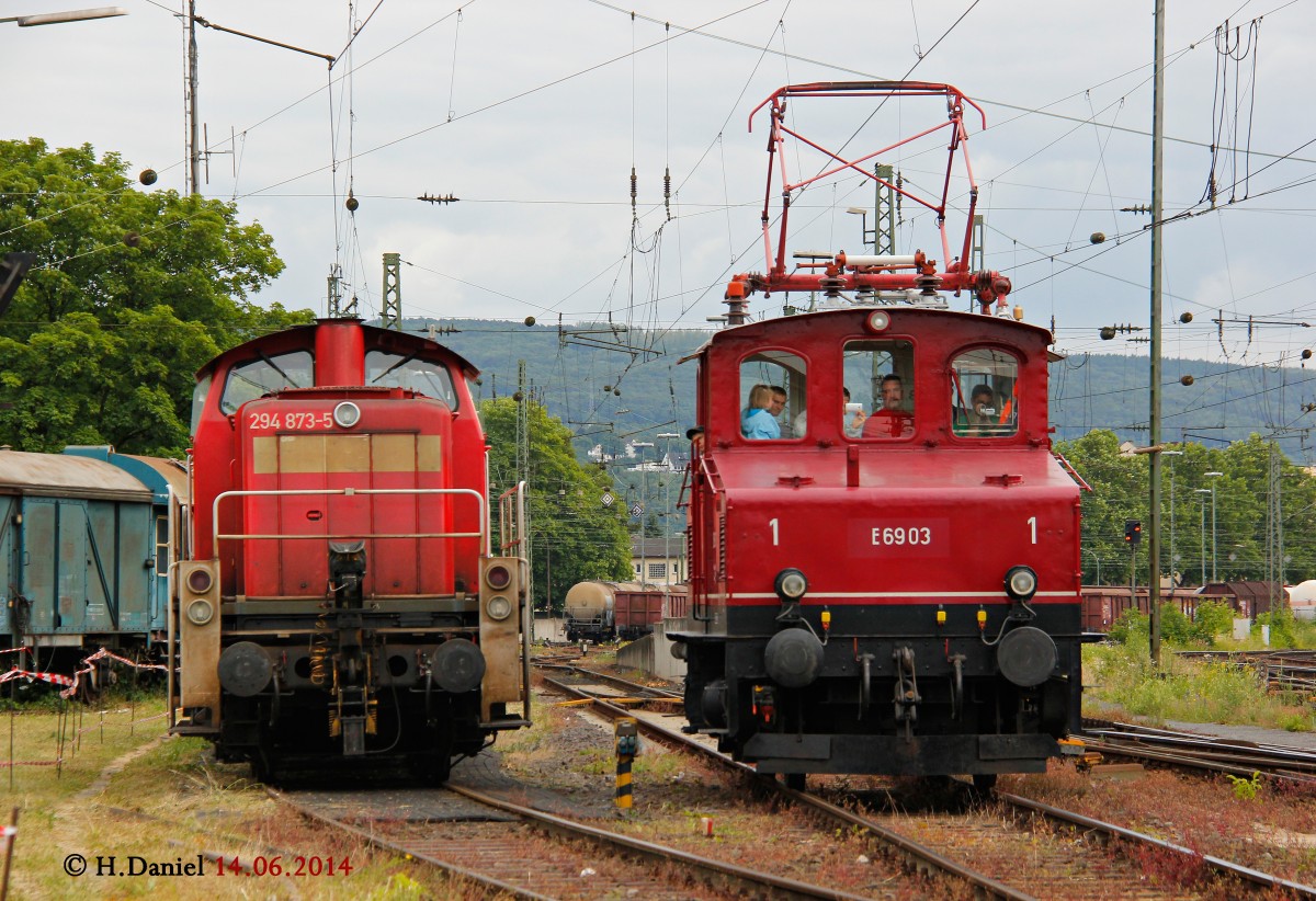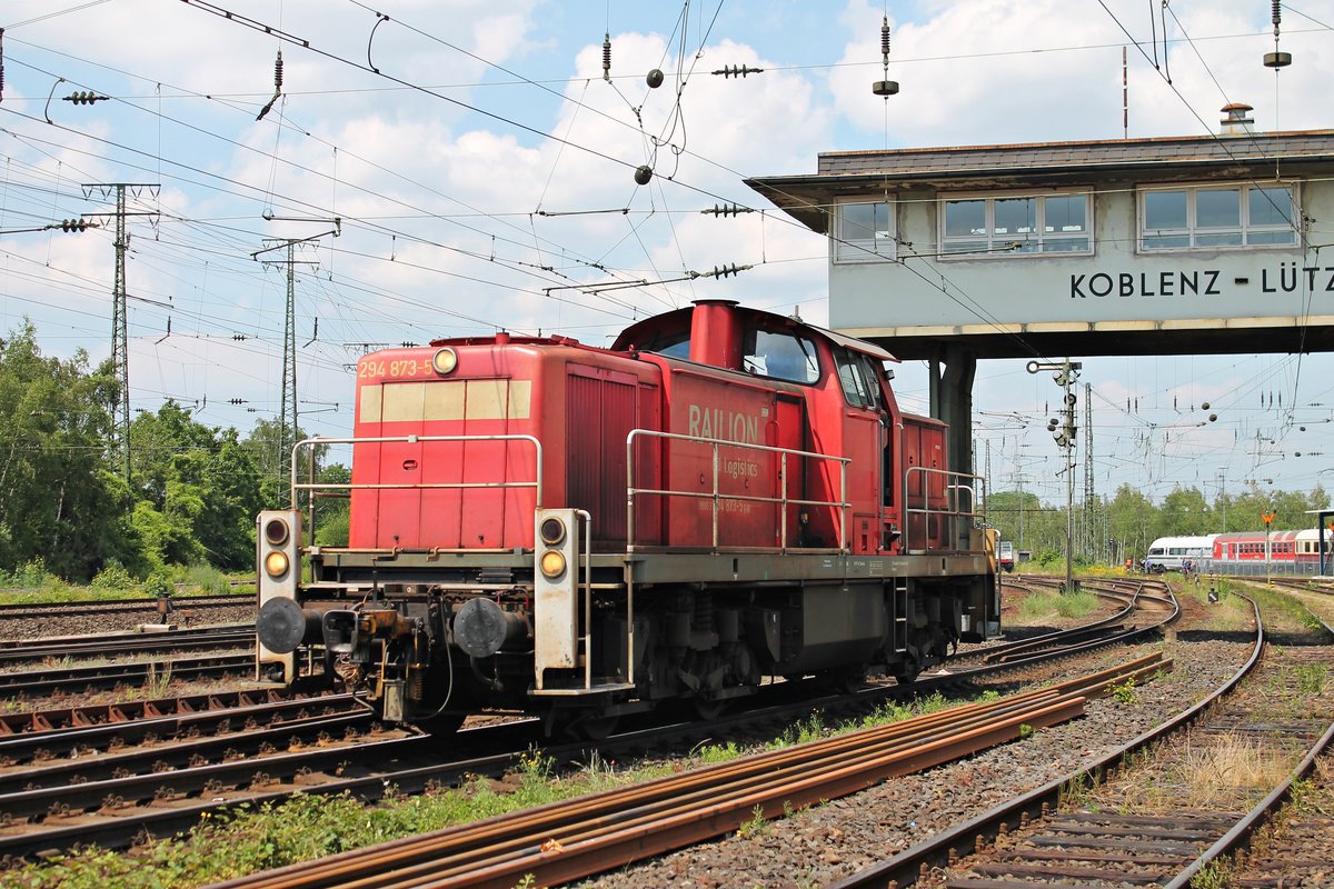 Am 22.06.2019 rangierte die 294 873-5 im Rangierbahnhof von Koblenz Lützel und kam hier unter dem alten Reiterstellwerk Richtung Ablaufberg durch, um kurz darauf wieder zurück in die andere Richtung zu fahren.