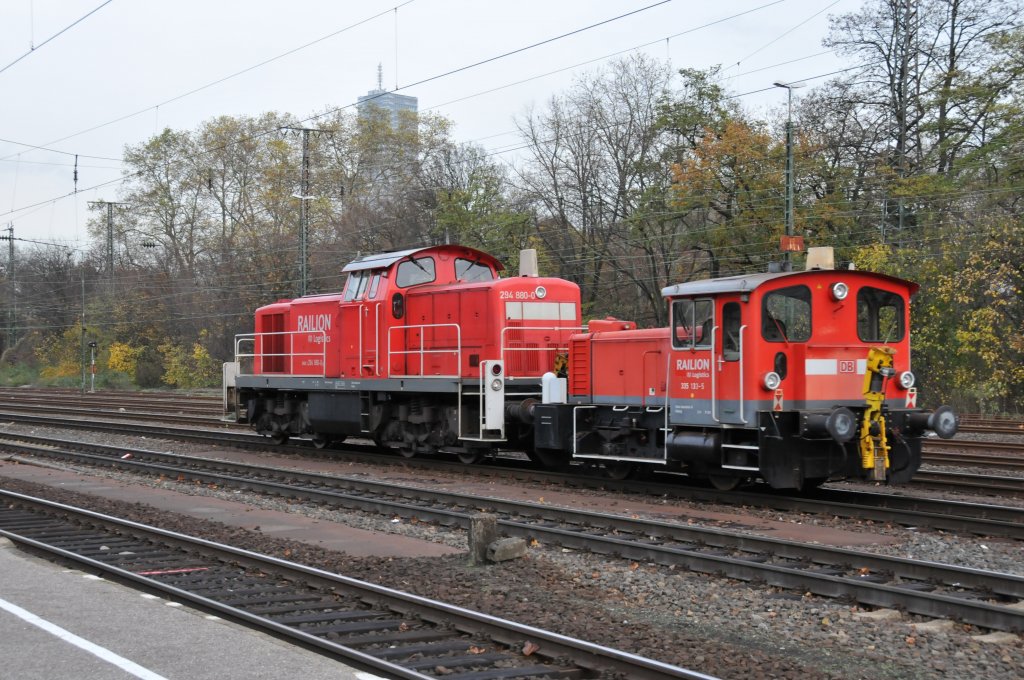 294 880-0 zieht eine Köf (335 133-5) durch Köln-West. Aufgenommen am 15/11/2010.
