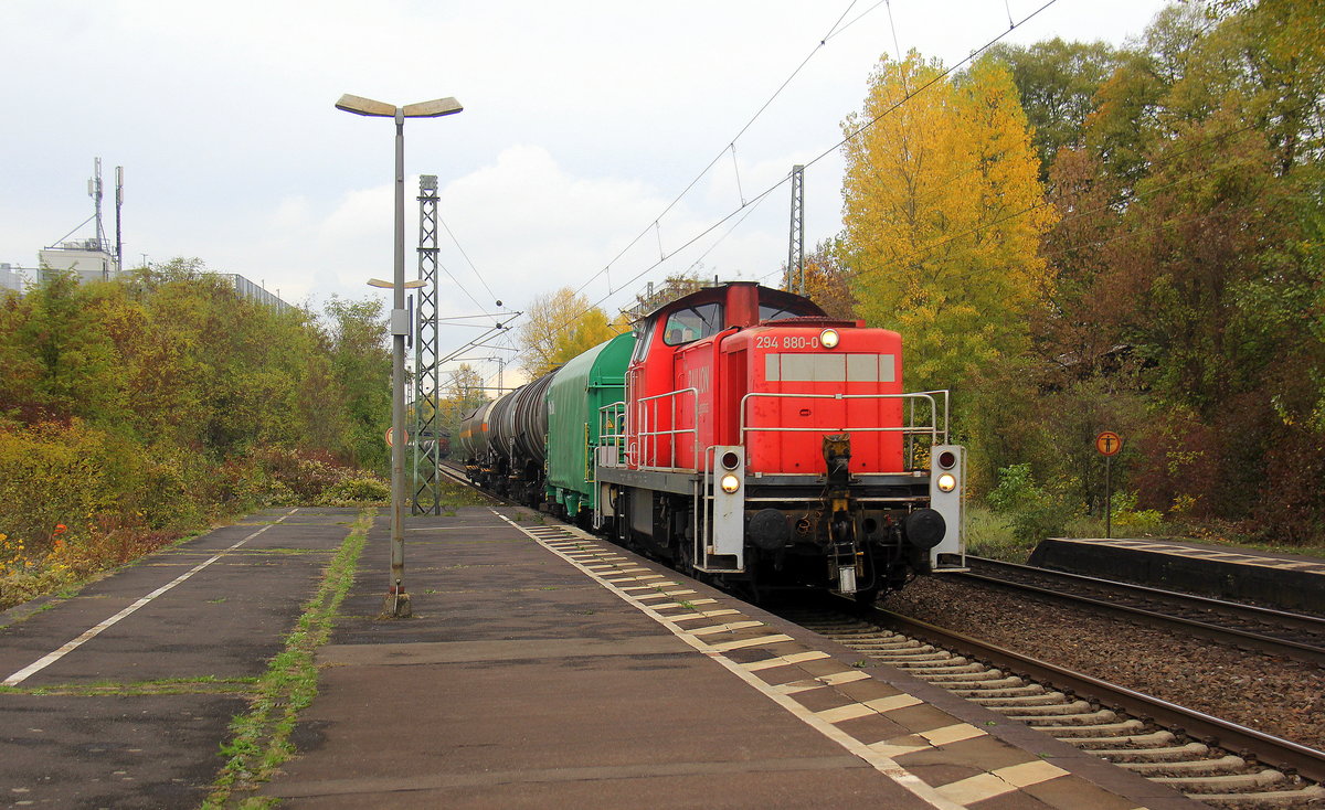 294 880-0 von DB-Railion kommt mit einem kurzen gemischten Güterzug aus Köln-Gremberg nach Königswinter und kommt aus Richtung Köln-Gremberg und fährt durch Bonn-Oberkassel in Richtung Königswinter. Aufgenommen vom Bahnsteig von Bonn-Oberkassel an der rechten Rheinstrecke. Am Nachmittag vom 2.11.2018.
