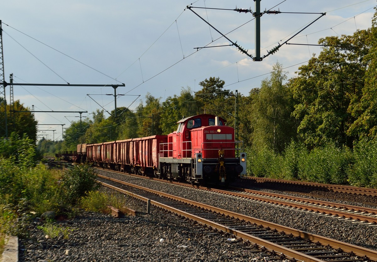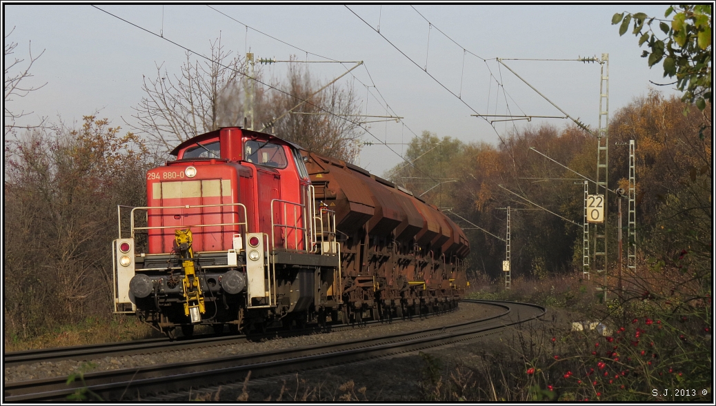Unerwartet kam die 294 880-0 mit einem Bauzug durch Korschenbroich in Richtung Neuss gefahren. Ich vermute das sie zwischen Erkelenz und Lindern im Einsatz war, da dort momentan Bauarbeiten statt finden. 11.9.2014