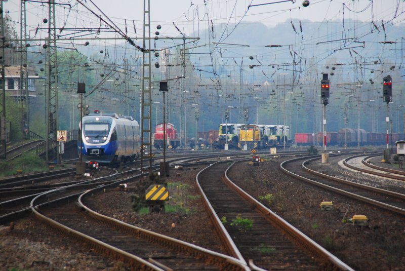 Hochbetrieb in Bielefeld-Brackwede. Derzeit wird es im Bahnhof von Bielefeld-Brackwede regelmäßig eng. Wegen Gleisbauarbeiten ist die Personenzugstrecke komplett gesperrt und der gesammte Verkehr läuft über die Güterzugstrecke. Links kommt die Talent VT704 der NordWestBahn von Bielefeld in Richtung Münster. Mittig wartet die Mak G 1205 V157 der TeutoburgerWaldEisenbahn auf freie Fahrt. Sie hat gerade die dahinter stehenden Wagons mit den grünen Claas-Mähdreschern gebracht und abgekoppelt. Weiter links wartet die 294 882-6 um in ihr Nachtquartier aufbrechen zu können. Hinter den Claas-Mähdreschern versteckt sich noch die 152 079-0 die ebenfalls auf Weiterfahrt wartet. Um das "Gewürge" perfekt zu machen, kamen noch die beiden planmäßigen ICE´s der Strecke "Berlin/Ostbahnhof - Köln/Hauptbahnhof mit dazu, die natürlich vor allen Vorrang haben.