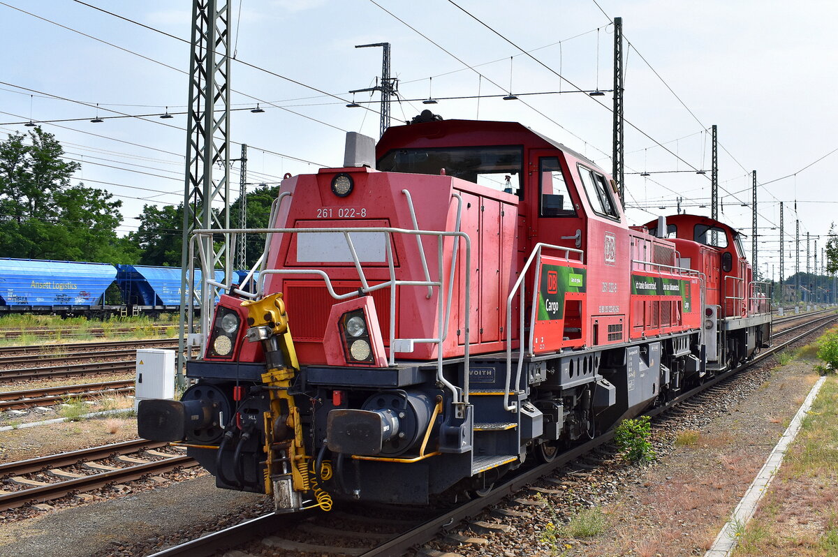 DB Cargo AG, Mainz mit dem Lokzug "261 022-8" (NVR: "92 80 1261 022-8 D-DB") mit "294 889-1" (NVR: "98 80 3294 889-1 D-DB") am Haken am 19.06.23 Durchfahrt Bahnhof Ruhland. Lothar Stöckmann