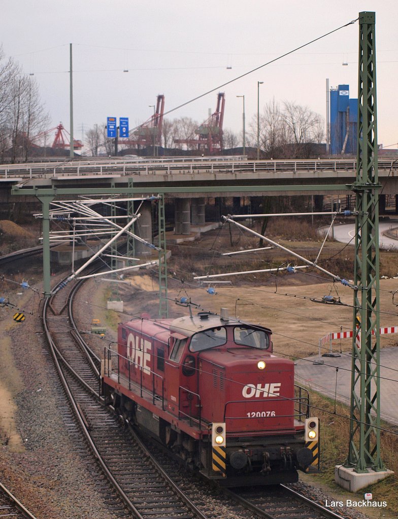 MaK G 1600 BB 120076 der OHE fährt am 27.02.10 kurz nach passieren der 295 065-7 durch die Verbindungskurve vom Rbf Alte Süderelbe zum Containerterminal Altenwerder.