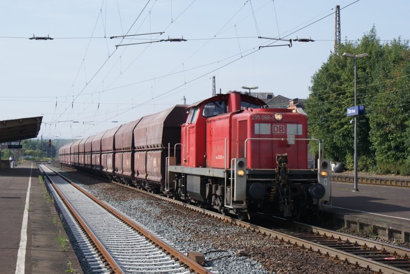 295 068-1 durchfuhr am 15.08.2009 den Elzer Bahnhof mit einem leeren Schotterzug,auf Gleis 3 in Richtung Norden.