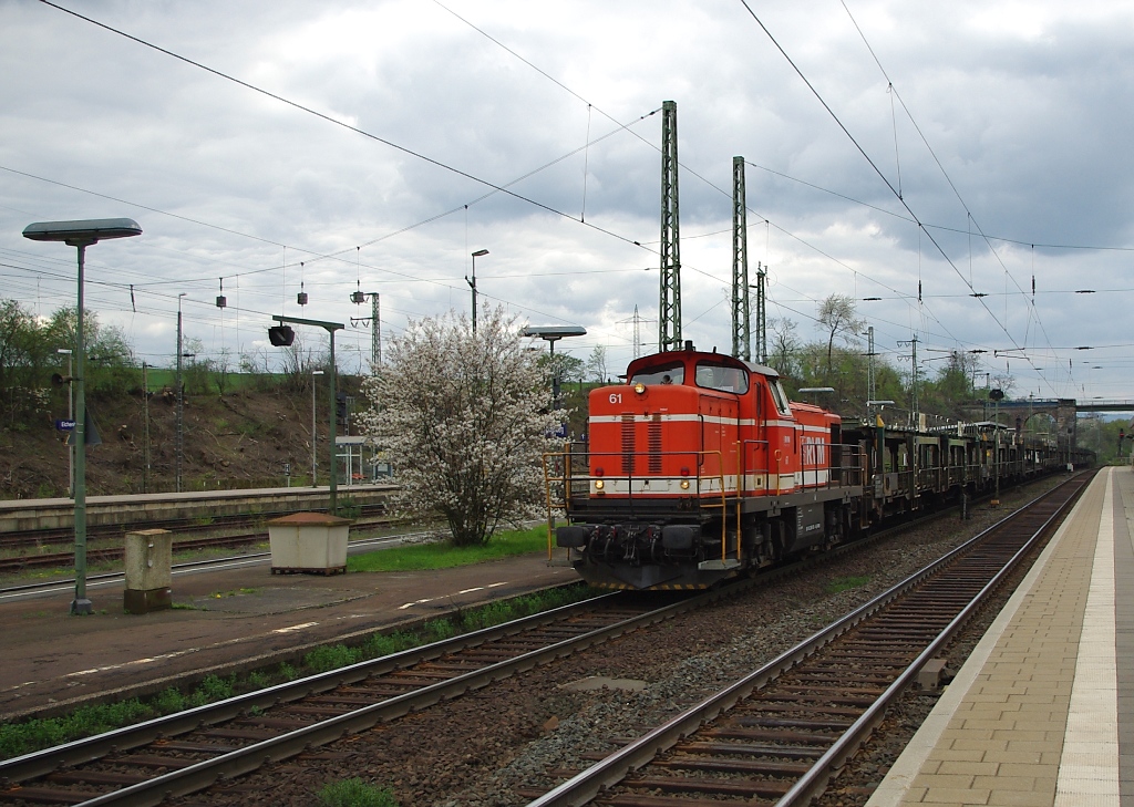 Ihre Größe kompensiert diese Lok mit ihrer Lautstärke. Mit diesem langen Autozug Richtung Norden mühte sich die 295 953-4 (Lok 61) der RVM hörbar ab. Aufgenommen am 16.04.2011 in Eichenberg.