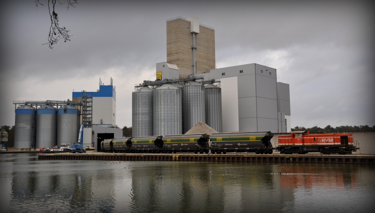 Diesellok 61 (295 953-4) der RVM (Regionalverkehr Münsterland GmbH) bei der Emsland Flour Mills GmbH & Co. in Spelle bei Rheine. Captrain-Wagen AGRO Terminal.