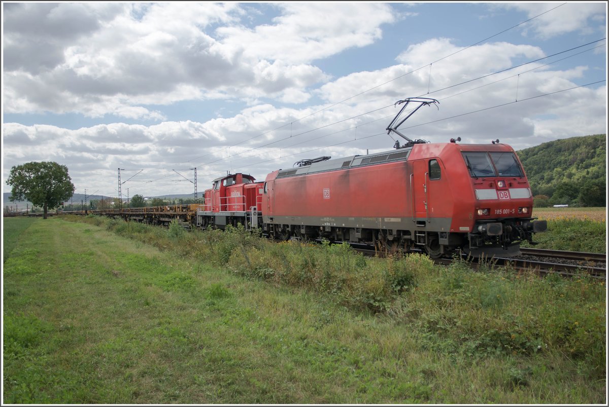 185 001-5 u.296 034-2 sind mit einen Schienenzug in Richtung Gemünden unterwegs,gesehen am 26.08.2020 bei Himmelstadt.