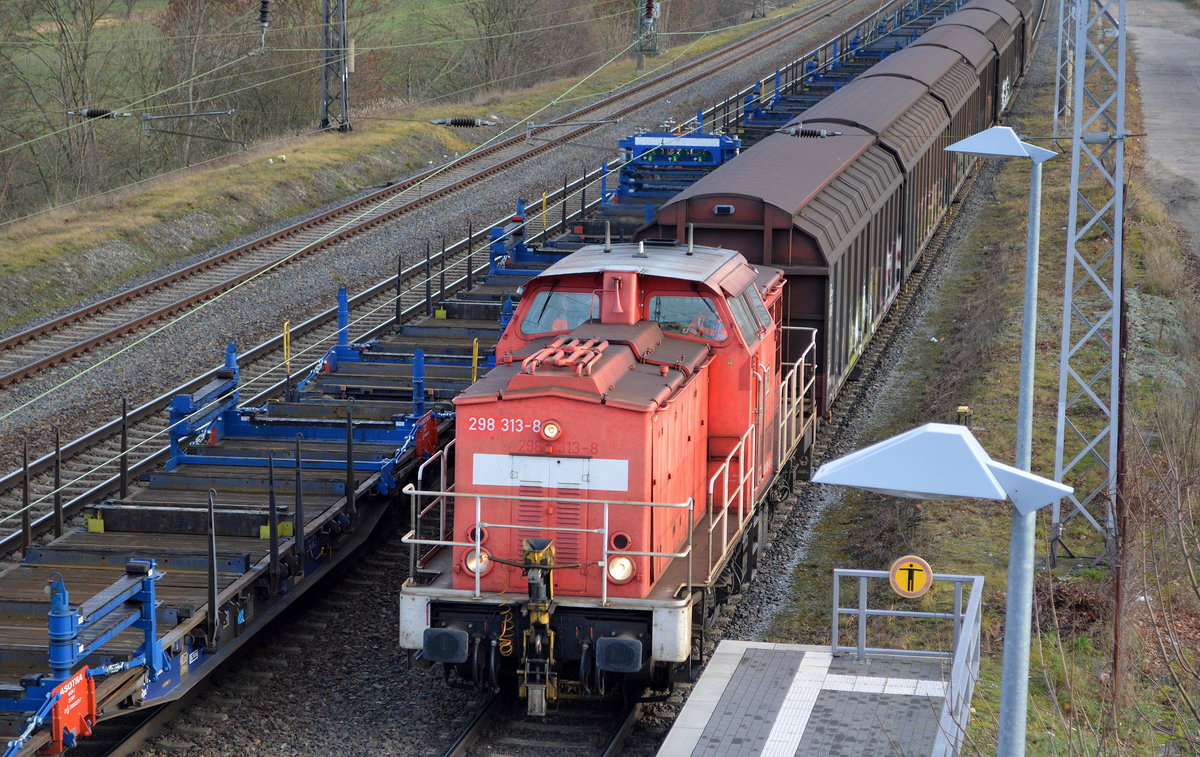 DB Cargo AG (D) mit "298 313-8" [NVR-Nummer: 98 80 3298 313-8 D-DB] und einigen Schiebewandwagen Richtung Rangierbahnhof Seddin am 17.12.20 Durchfahrt Bf. Saarmund. Lothar Stöckmann