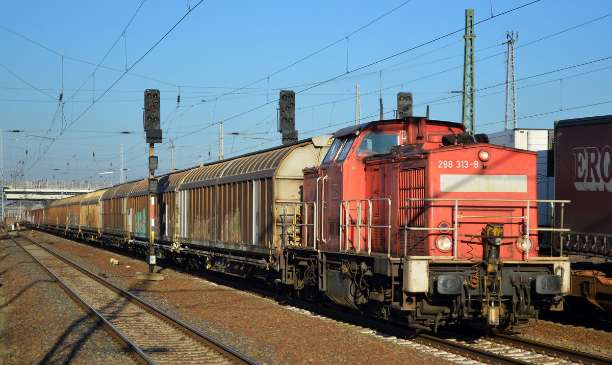 DB Cargo AG (D) mit "298 313-8" [NVR-Nummer: 98 80 3298 313-8 D-DB] und einigen Güterwagen im Übergabeverkehr am 01.11.21 Berlin Karow. Lothar Stöckmann