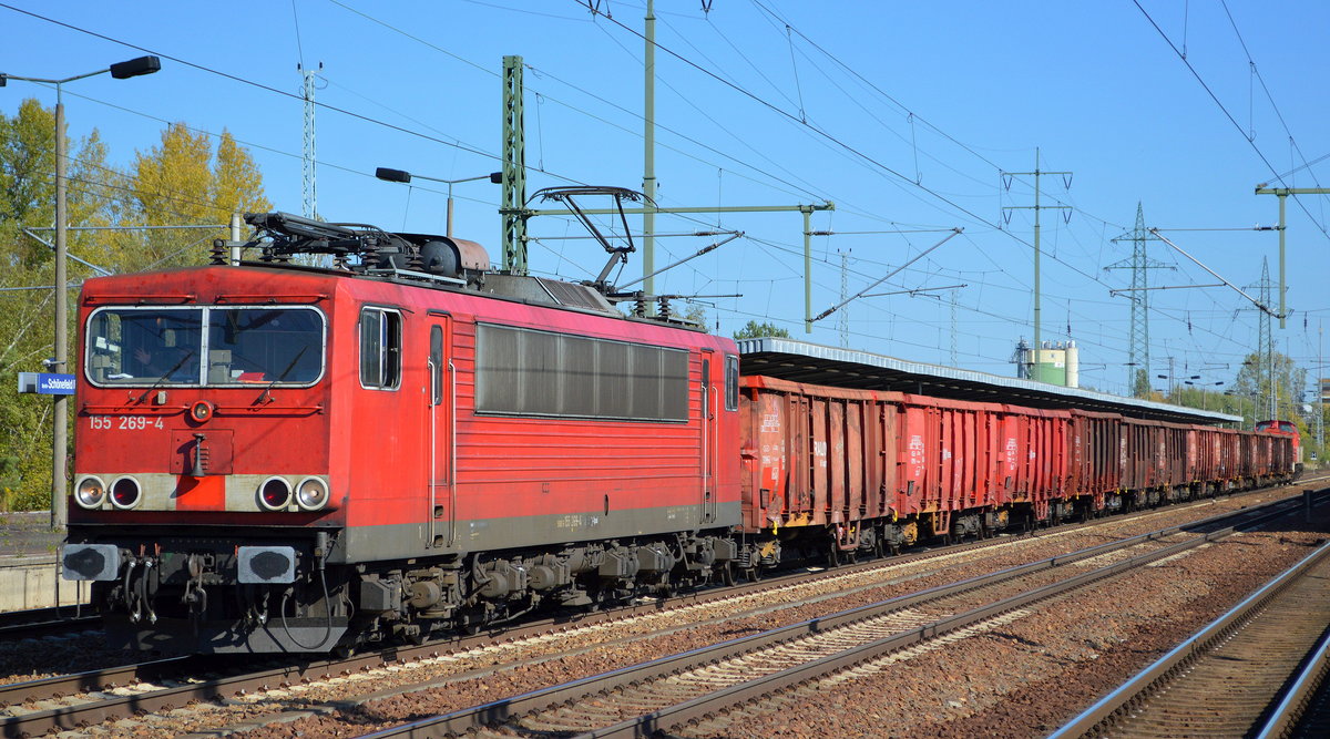 DB Cargo mit Rpool 155 269-4 (9180 6 155 269-4 D-Rpool) mit einem Güterzug offener Drehgestell-Güterwagen und hinten dran 298 313-8 am 05.10.18 Bf. Flughafen Berlin-Schönefeld. Lothar Stöckmann