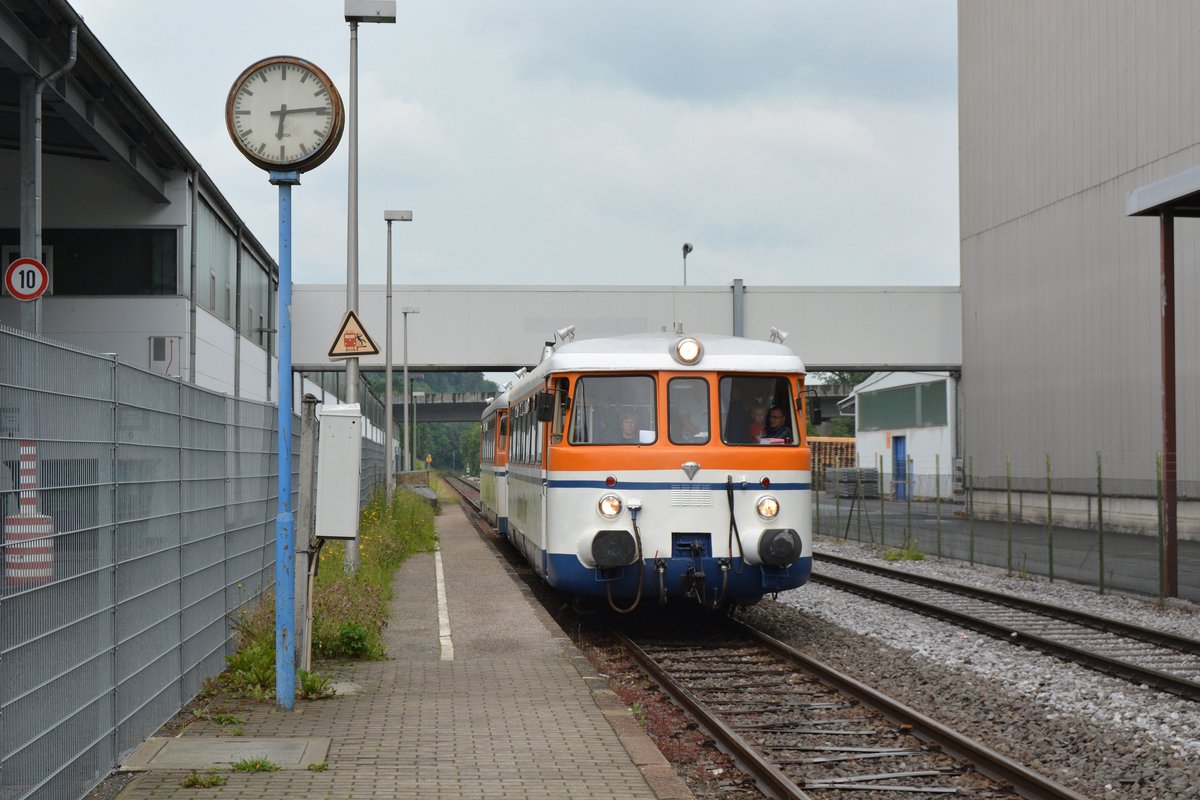 Einfahrt der MAN Schienenbusse 302 142-4 und 302 027-7 der Osningbahn am Haltepunkt Lendringsen. Anlass der Fahrten war das Jubiläum 60Jahre Hönnetalbahn.