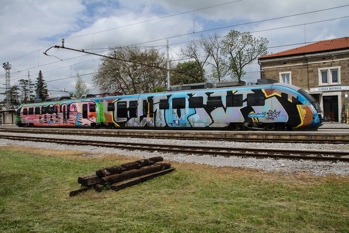 Auch in Slovenien gibt es viele Sprayer. Bunter Triebwagen 312-018-5 im Bahnhof von Ilirska Bistrica am 19.Mai 2016.