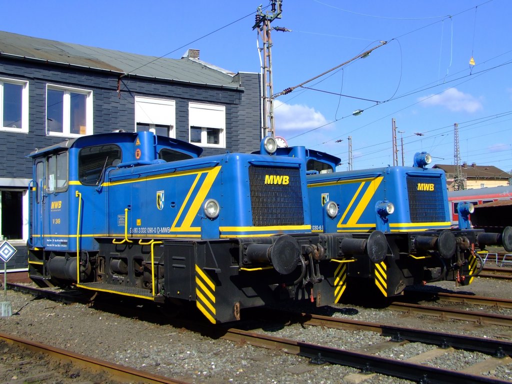 MWB V 246 ( ex DB 332 030-6, ex Köf 11 030) am 10.04.2010  im Südwestfälische Eisenbahnmuseum in Siegen. Die Lok wurde von Jung in Jungenthal bei Kirchen/Sieg (Fabr.-Nr. 13572) 1963 gebaut. Dahinter steht die MWB V 249 ( ex DB 332 090-0 bis1999, ex Köf 11 090).