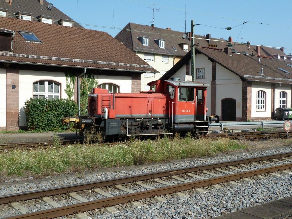 Die Köf im Profil: 335 140-0 drückt am Morgen des 22.08.11 eine Dosto-Garnitur aus dem Freiburger Hauptbahnhof Richtung Abstellung.