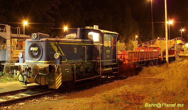 Die 335 212-7 (V252) der MWB (Mittelweserbahn) als Rangierlok für DB-Autozug mit Vorlauf- und Rampenwagen in Berlin-Wannsee nach dem Rangieren der Autotransportwagen zum Talgo-Hotelzug am 18.10.2009, 22:42 Uhr (der orangefarbene "Schatten" ist der Rangierer beim Abrüsten der Lok). M-DOS