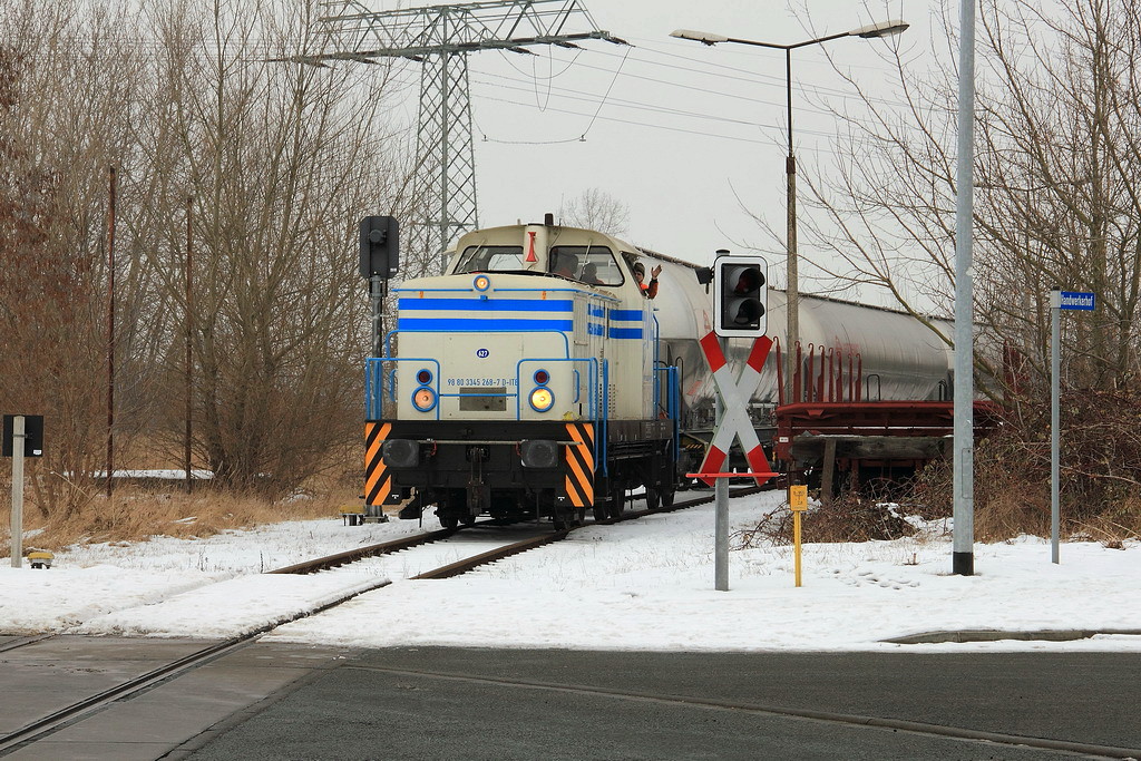 345 268-7 der Industrietransportgesellschaft mbH Brandenburg (ITB) steht am 14. Februar 2012 in Brandburg am unbeschrankten Bahnübergang Spitastrasse.